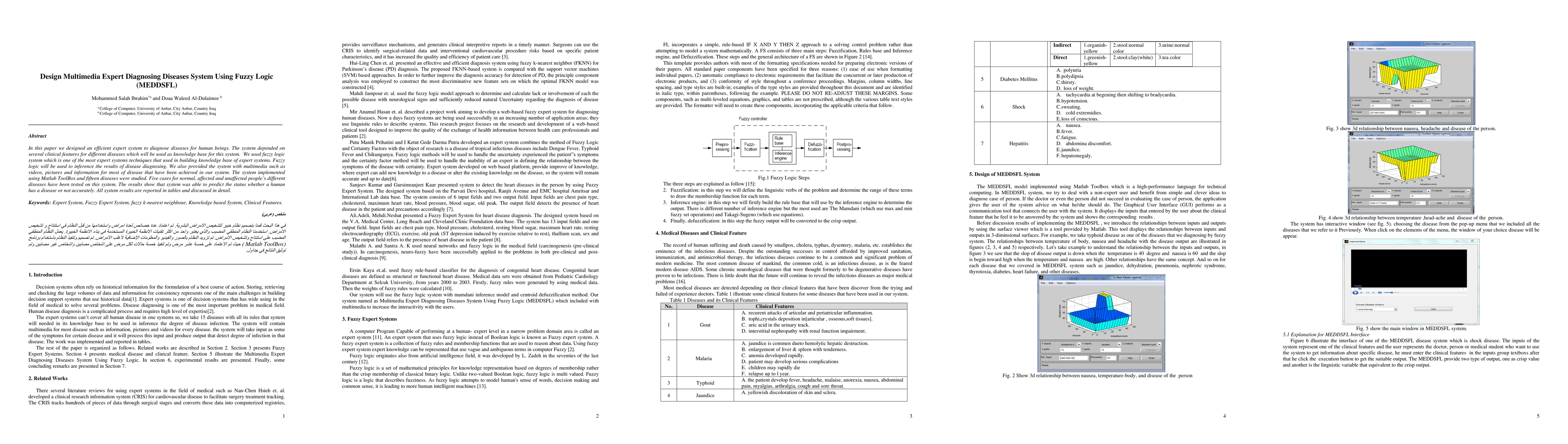 This paper presents a multimedia expert diagnosing diseases system (MEDDSFL) using fuzzy logic to infer disease status based on clinical features. Implemented in Matlab, the system incorporates multimedia resources and was tested on fifteen diseases, demonstrating accurate predictions of disease presence.