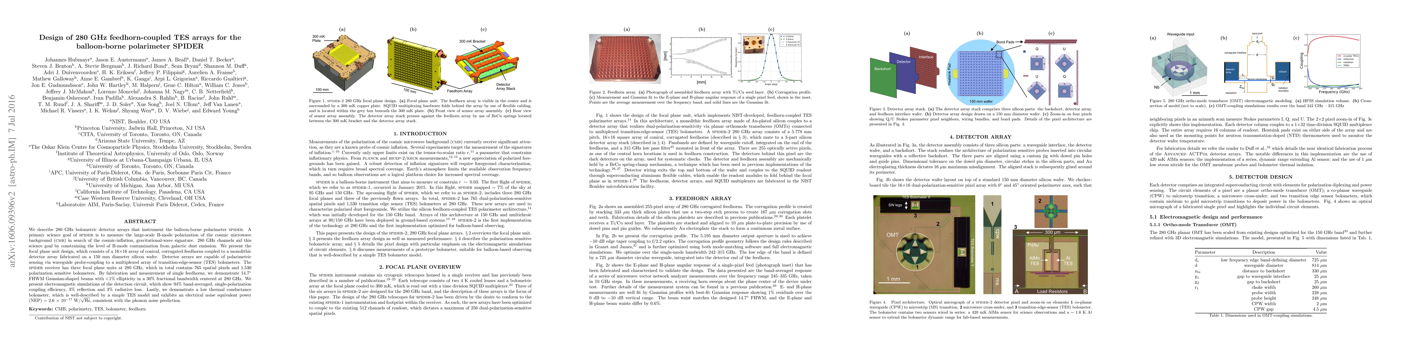 This paper details the design of 280 GHz bolometric detector arrays for the SPIDER balloon-borne polarimeter, aimed at measuring cosmic microwave background B-mode polarization. The focal plane unit features a 16x16 array of feedhorns coupled to TES bolometers, with demonstrated low ellipticity and high coupling efficiency.