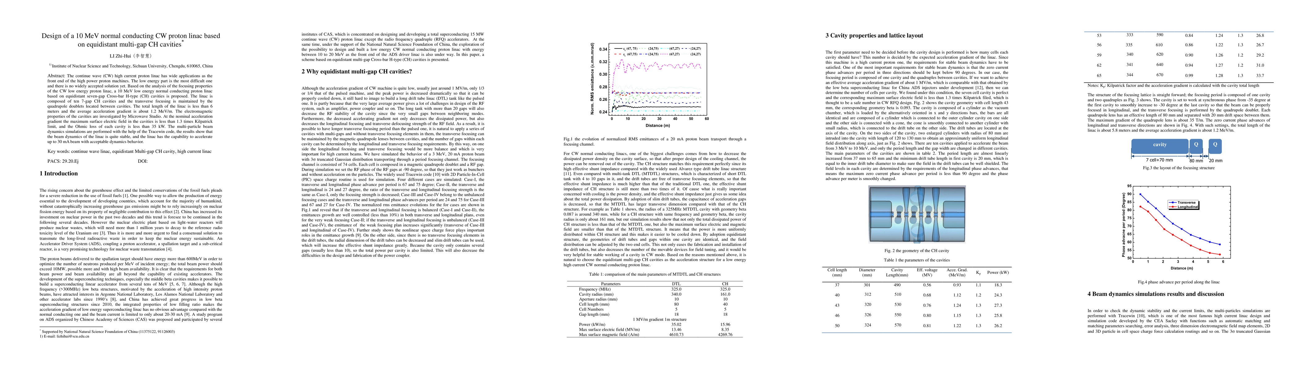 This paper proposes a 10 MeV normal conducting CW proton linac utilizing equidistant seven-gap CH cavities, achieving an average acceleration gradient of 1.2 MeV/m over a length of less than 6 meters. The design maintains stable beam dynamics for currents up to 30 mA.