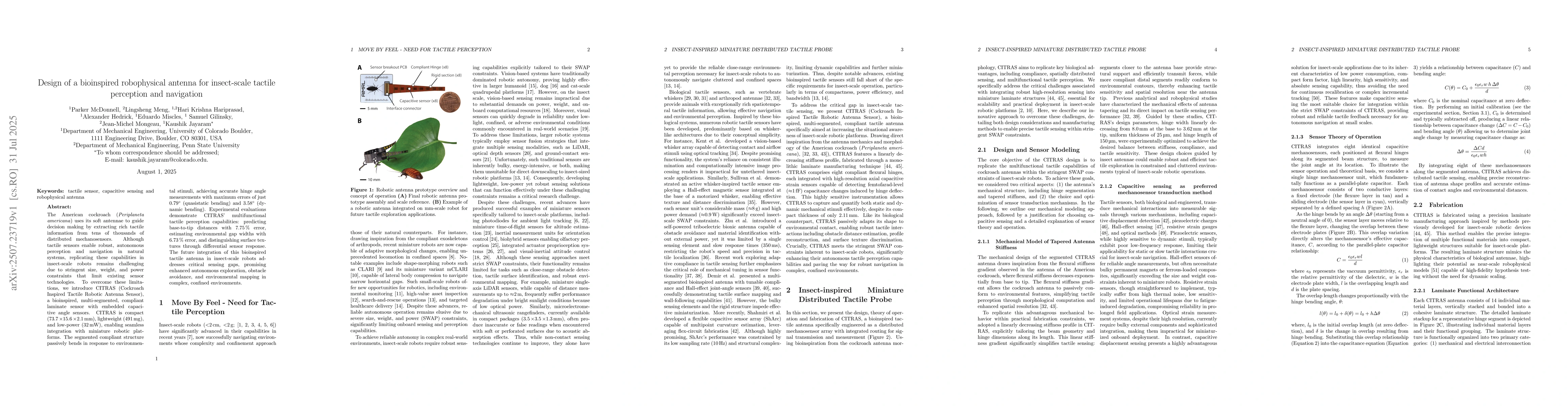 The American cockroach (Periplaneta americana) uses its soft antennae to guide decision making by extracting rich tactile information from tens of thousands of distributed mechanosensors. Although tactile sensors enable robust, autonomous perception and navigation in natural systems, replicating these capabilities in insect-scale robots remains challenging due to stringent size, weight, and power constraints that limit existing sensor technologies. To overcome these limitations, we introduce CITRAS (Cockroach Inspired Tactile Robotic Antenna Sensor), a bioinspired, multi-segmented, compliant laminate sensor with embedded capacitive angle sensors. CITRAS is compact (73.7x15.6x2.1 mm), lightweight (491 mg), and low-power (32 mW), enabling seamless integration with miniature robotic platforms. The segmented compliant structure passively bends in response to environmental stimuli, achieving accurate hinge angle measurements with maximum errors of just 0.79 degree (quasistatic bending) and 3.58 degree (dynamic bending). Experimental evaluations demonstrate CITRAS' multifunctional tactile perception capabilities: predicting base-to-tip distances with 7.75 % error, estimating environmental gap widths with 6.73 % error, and distinguishing surface textures through differential sensor response. The future integration of this bioinspired tactile antenna in insect-scale robots addresses critical sensing gaps, promising enhanced autonomous exploration, obstacle avoidance, and environmental mapping in complex, confined environments.