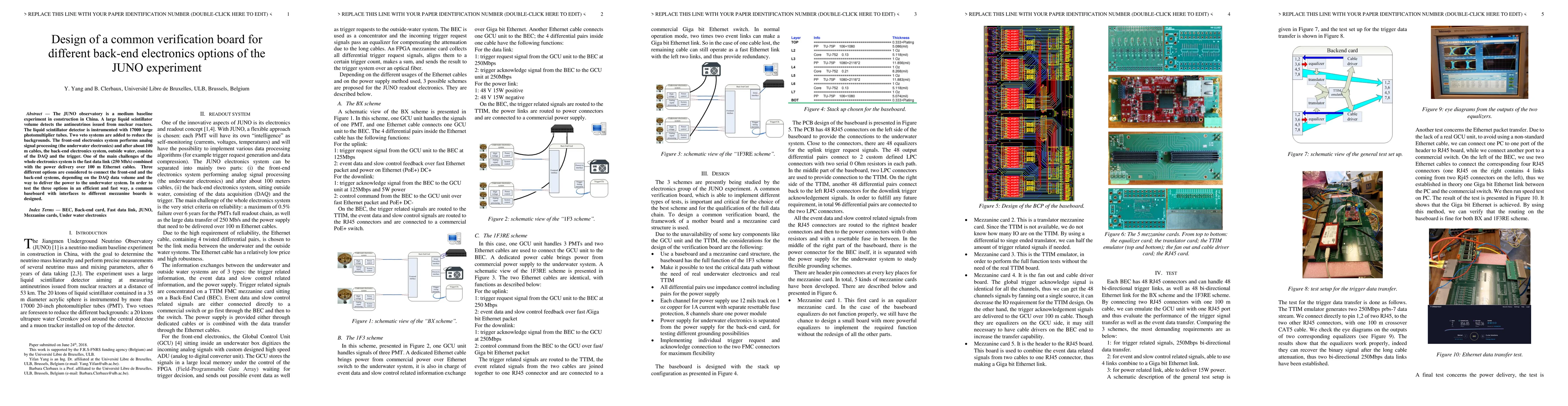 This paper details the design of a common verification board for testing different back-end electronics options in the JUNO experiment, which uses a large liquid scintillator detector to detect antineutrinos from nuclear reactors. The board facilitates efficient testing of three connection options for the front-end and back-end systems, addressing challenges like high-speed data links and power delivery over long distances.