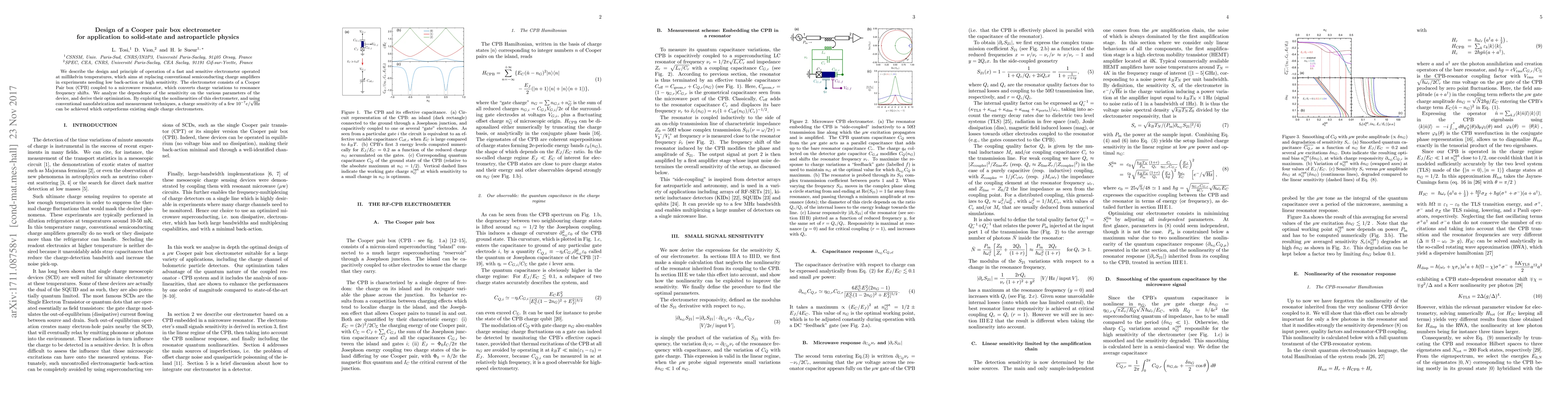 This paper details the design of a Cooper Pair Box electrometer for low-temperature applications in solid-state and astroparticle physics, achieving high sensitivity and low back-action. The device converts charge variations into frequency shifts in a microwave resonator, optimizing parameters to reach a charge sensitivity of $10^{-7} e / \sqrt{Hz}$.