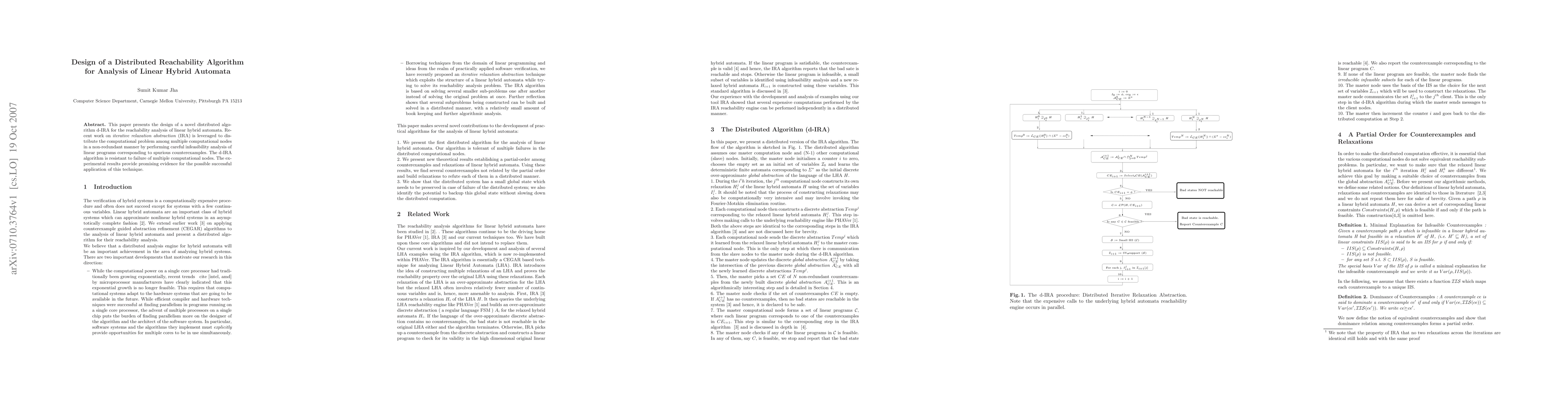 A novel distributed algorithm called d-IRA is designed to analyze linear hybrid automata more efficiently by distributing the computational problem among multiple nodes, making it resistant to failure.