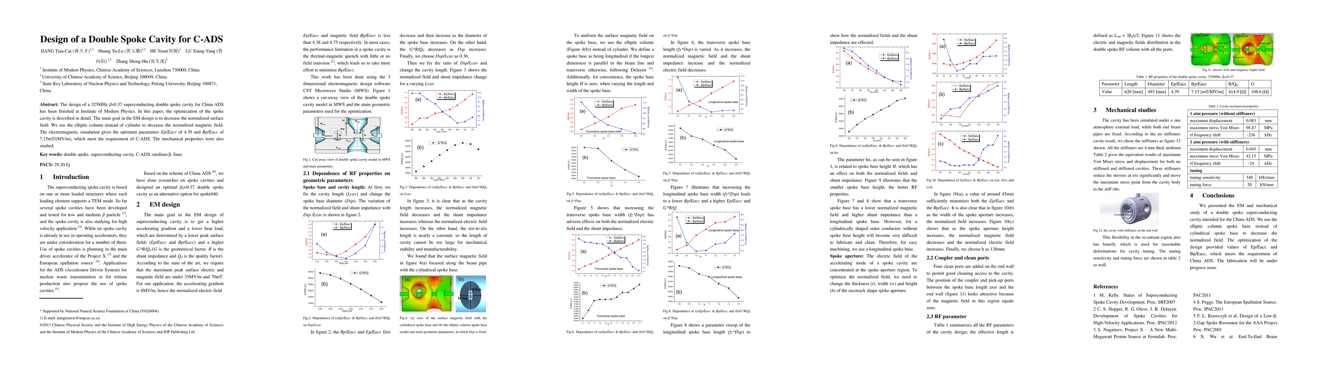 The design of a double spoke superconducting cavity with optimized geometric parameters for reduced normalized surface fields, specifically utilizing an elliptic column spoke base.