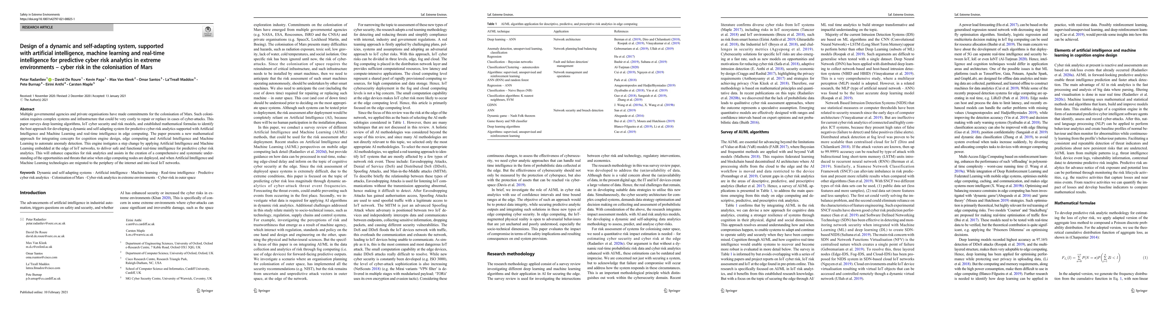 Multiple governmental agencies and private organisations have made commitments for the colonisation of Mars. Such colonisation requires complex systems and infrastructure that could be very costly to repair or replace in cases of cyber attacks. This paper surveys deep learning algorithms, IoT cyber security and risk models, and established mathematical formulas to identify the best approach for developing a dynamic and self adapting system for predictive cyber risk analytics supported with Artificial Intelligence and Machine Learning and real time intelligence in edge computing. The paper presents a new mathematical approach for integrating concepts for cognition engine design, edge computing and Artificial Intelligence and Machine Learning to automate anomaly detection. This engine instigates a step change by applying Artificial Intelligence and Machine Learning embedded at the edge of IoT networks, to deliver safe and functional real time intelligence for predictive cyber risk analytics. This will enhance capacities for risk analytics and assists in the creation of a comprehensive and systematic understanding of the opportunities and threats that arise when edge computing nodes are deployed, and when Artificial Intelligence and Machine Learning technologies are migrated to the periphery of the internet and into local IoT networks.