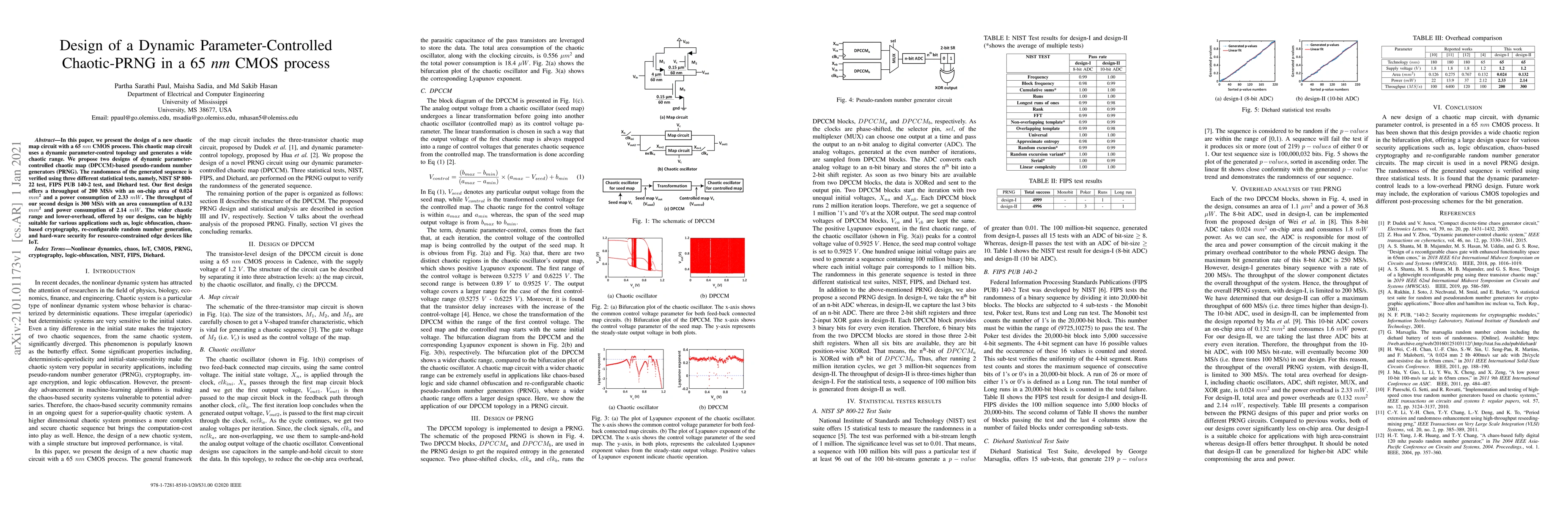 In this paper, we present the design of a new chaotic map circuit with a 65nm CMOS process. This chaotic map circuit uses a dynamic parameter-control topology and generates a wide chaotic range. We propose two designs of dynamic parameter-controlled chaotic map (DPCCM)-based pseudo-random number generators (PRNG). The randomness of the generated sequence is verified using three different statistical tests, namely, NIST SP 800-22 test, FIPS PUB 140-2 test, and Diehard test. Our first design offers a throughput of 200 MS/s with an on-chip area of 0.024mm2 and a power consumption of 2.33mW. The throughput of our second design is 300 MS/s with an area consumption of 0.132mm2 and power consumption of 2.14mW. The wider chaotic range and lower-overhead, offered by our designs, can be highly suitable for various applications such as, logic obfuscation, chaos-based cryptography, re-configurable random number generation,and hard-ware security for resource-constrained edge devices like IoT.