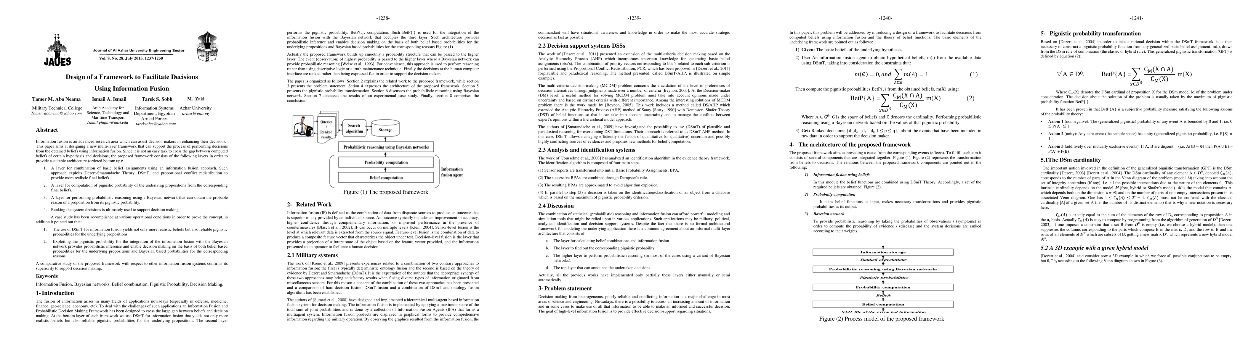 Information fusion is an advanced research area which can assist decision makers in enhancing their decisions. This paper aims at designing a new multi-layer framework that can support the process of performing decisions from the obtained beliefs using information fusion. Since it is not an easy task to cross the gap between computed beliefs of certain hypothesis and decisions, the proposed framework consists of the following layers in order to provide a suitable architecture (ordered bottom up): 1. A layer for combination of basic belief assignments using an information fusion approach. Such approach exploits Dezert-Smarandache Theory, DSmT, and proportional conflict redistribution to provide more realistic final beliefs. 2. A layer for computation of pignistic probability of the underlying propositions from the corresponding final beliefs. 3. A layer for performing probabilistic reasoning using a Bayesian network that can obtain the probable reason of a proposition from its pignistic probability. 4. Ranking the system decisions is ultimately used to support decision making. A case study has been accomplished at various operational conditions in order to prove the concept, in addition it pointed out that: 1. The use of DSmT for information fusion yields not only more realistic beliefs but also reliable pignistic probabilities for the underlying propositions. 2. Exploiting the pignistic probability for the integration of the information fusion with the Bayesian network provides probabilistic inference and enable decision making on the basis of both belief based probabilities for the underlying propositions and Bayesian based probabilities for the corresponding reasons. A comparative study of the proposed framework with respect to other information fusion systems confirms its superiority to support decision making.