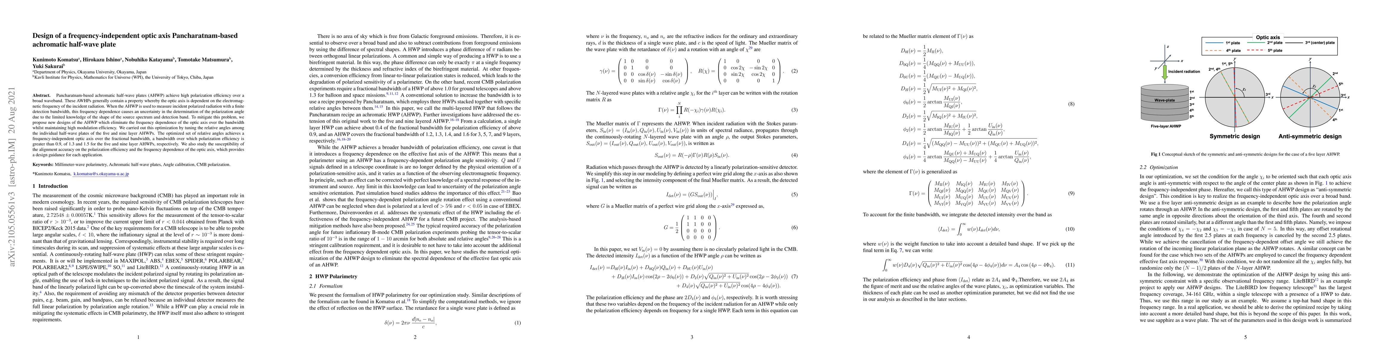 Pancharatnam-based achromatic half-wave plates (AHWP) achieve high polarization efficiency over a broad waveband. These AWHPs generally contain a property whereby the optic axis is dependent on the electromagnetic frequency of the incident radiation. When the AHWP is used to measure incident polarized radiation with a finite detection bandwidth, this frequency dependence causes an uncertainty in the determination of the polarization angle due to the limited knowledge of the shape of the source spectrum and detection band. To mitigate this problem, we propose new designs of the AHWP which eliminate the frequency dependence of the optic axis over the bandwidth whilst maintaining high modulation efficiency. We carried out this optimization by tuning the relative angles among the individual half-wave plates of the five and nine layer AHWPs. The optimized set of relative angles achieves a frequency-independent optic axis over the fractional bandwidth, a bandwidth over which polarization efficiency is greater than 0.9, of 1.3 and 1.5 for the five and nine layer AHWPs, respectively. We also study the susceptibility of the alignment accuracy on the polarization efficiency and the frequency dependence of the optic axis, which provides a design guidance for each application.