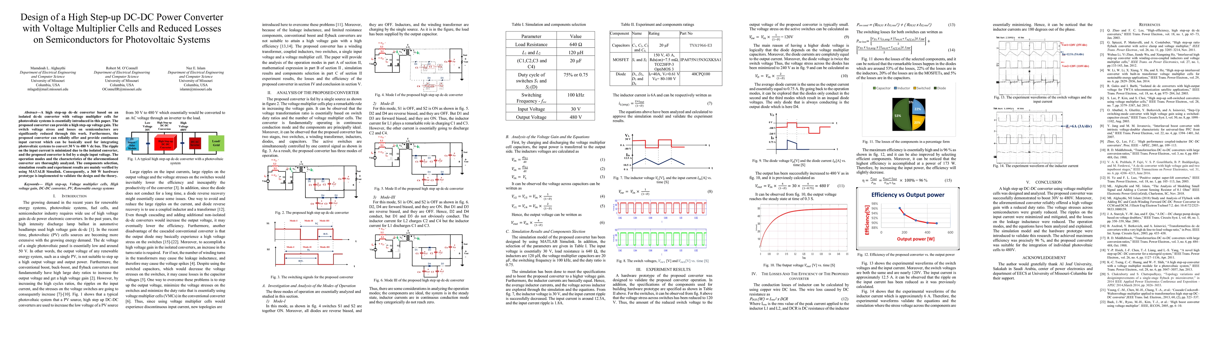 A high step up dc dc converter based on an isolated dc dc converter with voltage multiplier cells for photovoltaic systems is essentially introduced in this paper. The proposed converter can provide a high step up voltage gain. The switch voltage stress and losses on semiconductors are significantly reduced through this work. Furthermore, the proposed converter can reliably offer and provide continuous input current which can be basically used for integrating photovoltaic systems to convert 30 V to 480 V dc bus. The ripple on the input current is minimized due to the isolated converter, and the proposed converter is fed by a single input voltage. The operation modes and the characteristics of the aforementioned converter are thoroughly analyzed. The components selection, simulation results and experiment results are mainly verified by using MATALB Simulink. Consequently, a 360 W hardware prototype is implemented to validate the design and the theory.