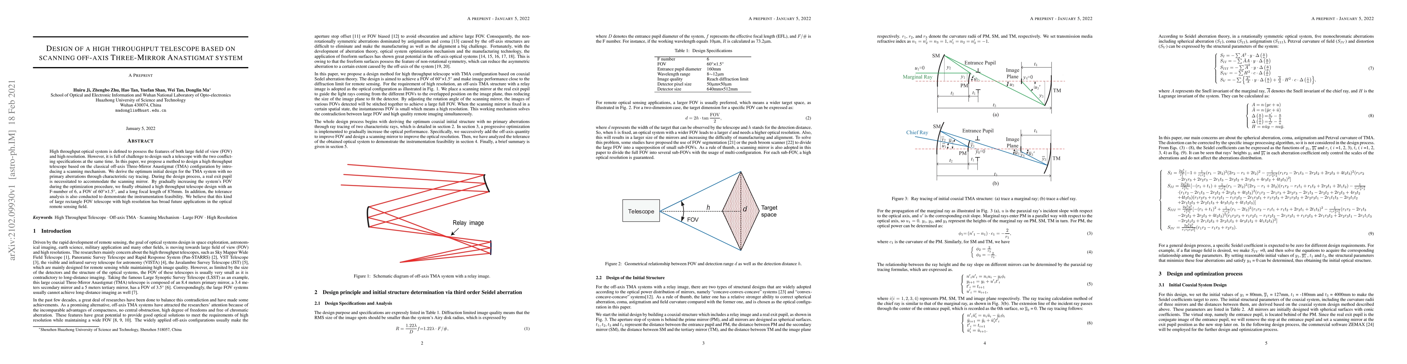 This paper proposes a high throughput telescope design using a scanning off-axis Three-Mirror Anastigmat system, achieving a large field of view and high resolution through characteristic ray tracing and optimization. The final design features an F-number of 6, a FOV of 60°x1.5°, and a focal length of 876mm, with feasibility demonstrated through tolerance analysis.