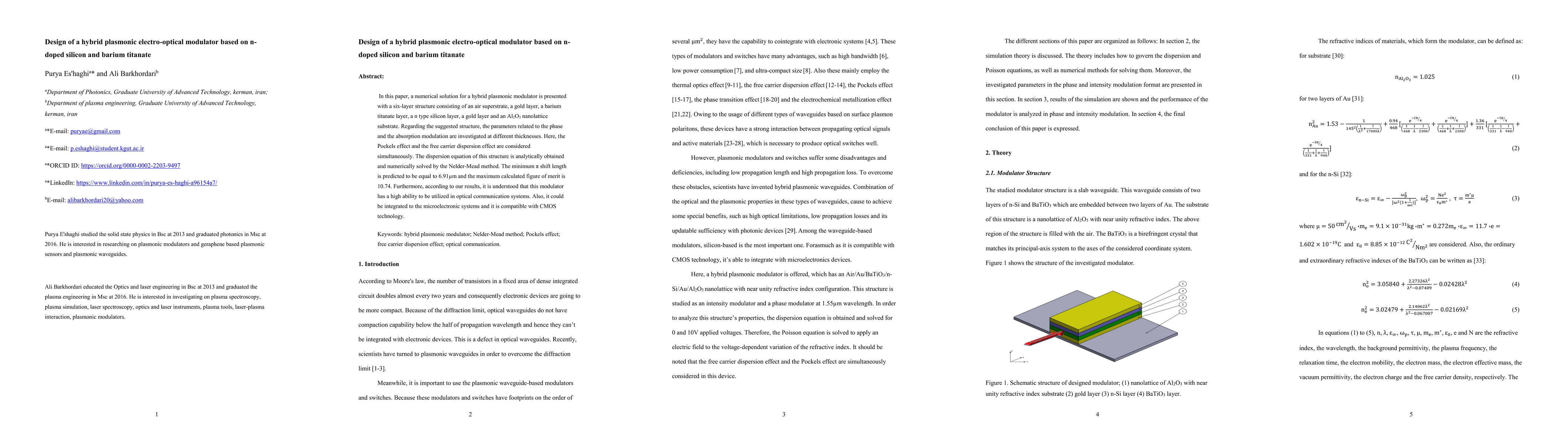This paper designs a hybrid plasmonic electro-optical modulator using a six-layer structure with n-doped silicon and barium titanate, achieving a minimum π shift length of 6.91 μm and a high figure of merit of 10.74, making it suitable for optical communication and CMOS integration.