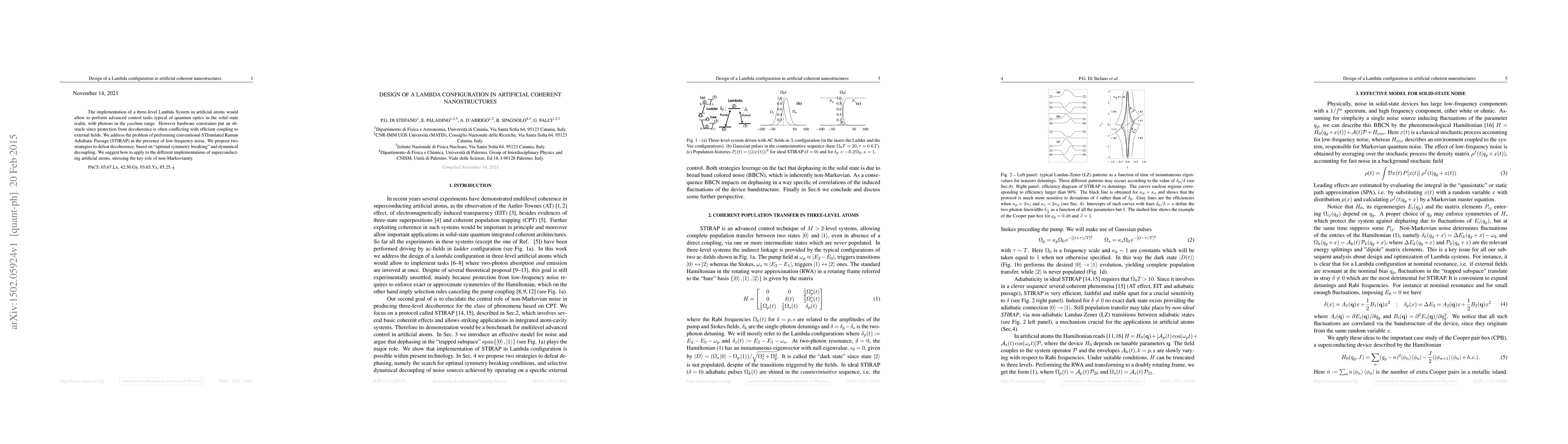 The implementation of a three-level Lambda System in artificial atoms would allow to perform advanced control tasks typical of quantum optics in the solid state realm, with photons in the $\mathrm{\mu m}$/mm range. However hardware constraints put an obstacle since protection from decoherence is often conflicting with efficient coupling to external fields. We address the problem of performing conventional STImulated Raman Adiabatic Passage (STIRAP) in the presence of low-frequency noise. We propose two strategies to defeat decoherence, based on "optimal symmetry breaking" and dynamical decoupling. We suggest how to apply to the different implementations of superconducting artificial atoms, stressing the key role of non-Markovianity.