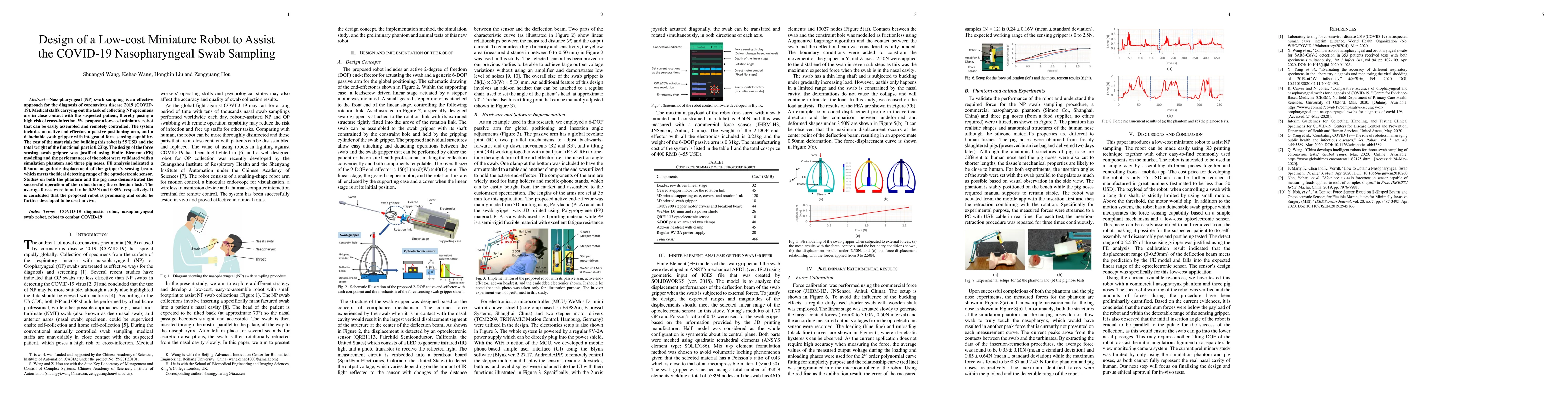 Nasopharyngeal (NP) swab sampling is an effective approach for the diagnosis of coronavirus disease 2019 (COVID-19). Medical staffs carrying out the task of collecting NP specimens are in close contact with the suspected patient, thereby posing a high risk of cross-infection. We propose a low-cost miniature robot that can be easily assembled and remotely controlled. The system includes an active end-effector, a passive positioning arm, and a detachable swab gripper with integrated force sensing capability. The cost of the materials for building this robot is 55 USD and the total weight of the functional part is 0.23kg. The design of the force sensing swab gripper was justified using Finite Element (FE) modeling and the performances of the robot were validated with a simulation phantom and three pig noses. FE analysis indicated a 0.5mm magnitude displacement of the gripper's sensing beam, which meets the ideal detecting range of the optoelectronic sensor. Studies on both the phantom and the pig nose demonstrated the successful operation of the robot during the collection task. The average forces were found to be 0.35N and 0.85N, respectively. It is concluded that the proposed robot is promising and could be further developed to be used in vivo.