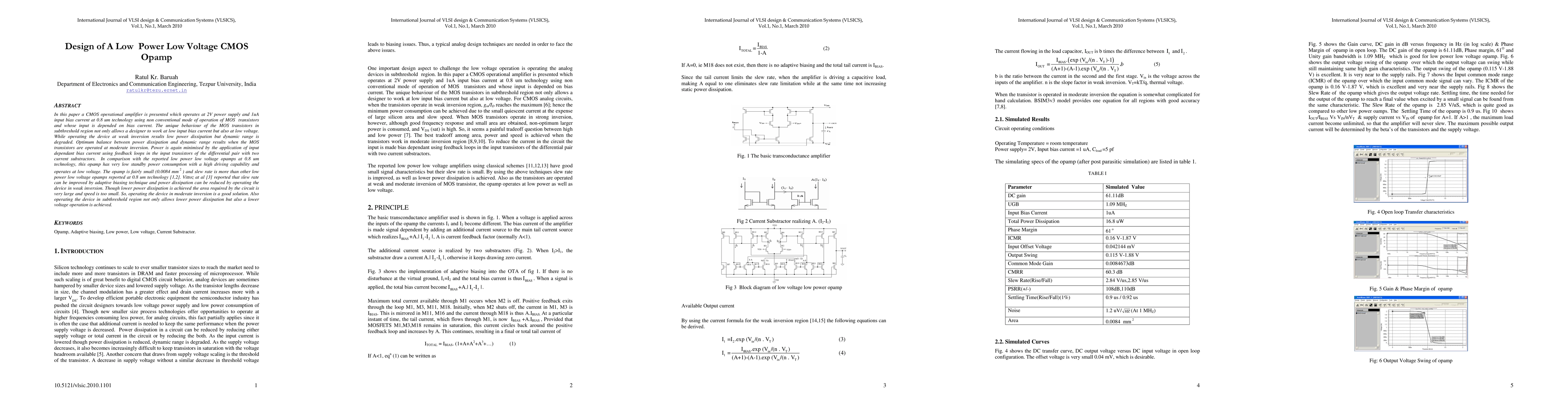This paper designs a low power, low voltage CMOS operational amplifier operating at 2V and 1µA input bias current using subthreshold MOS transistor operation and adaptive biasing. It achieves a balance between power dissipation and dynamic range by operating transistors in moderate inversion, resulting in low standby power, high driving capability, and a higher slew rate compared to similar low power opamps.