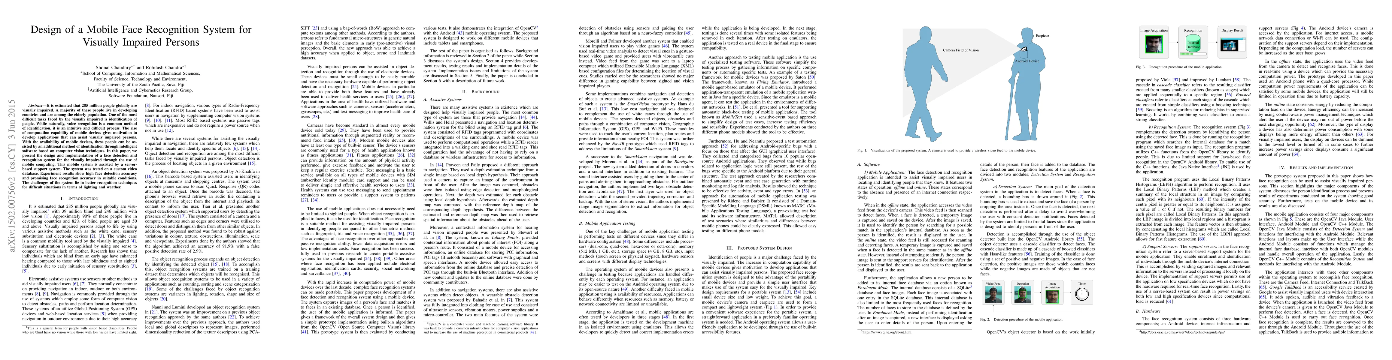 This paper presents a mobile face recognition system designed to assist visually impaired individuals in identifying people using computer vision techniques. The system combines mobile device capabilities with a server-based support system, showing high accuracy in face detection and recognition under suitable conditions, though challenges remain in adverse lighting and weather conditions.