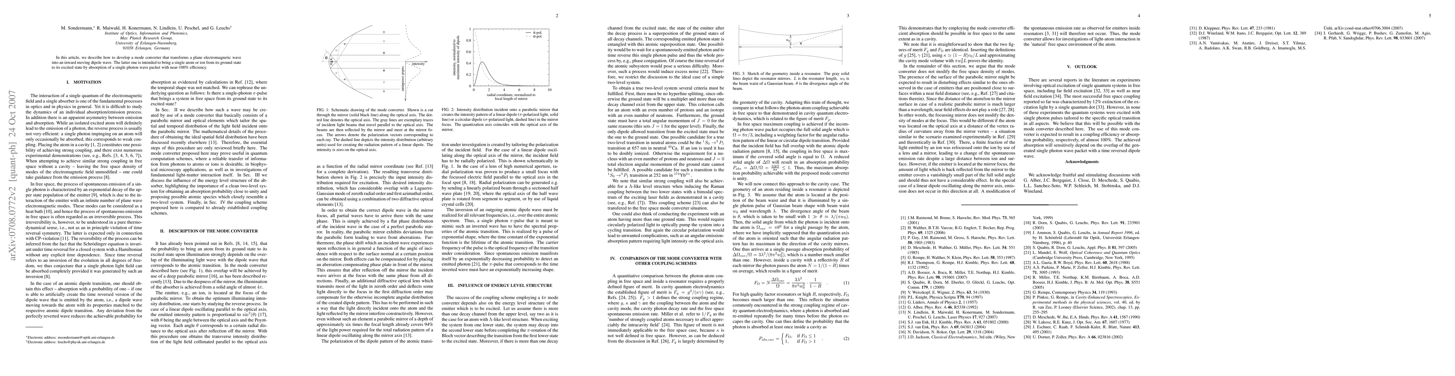 In this article, we describe how to develop a mode converter that transforms a plane electromagnetic wave into an inward moving dipole wave. The latter one is intended to bring a single atom or ion from its ground state to its excited state by absorption of a single photon wave packet with near-100% efficiency.