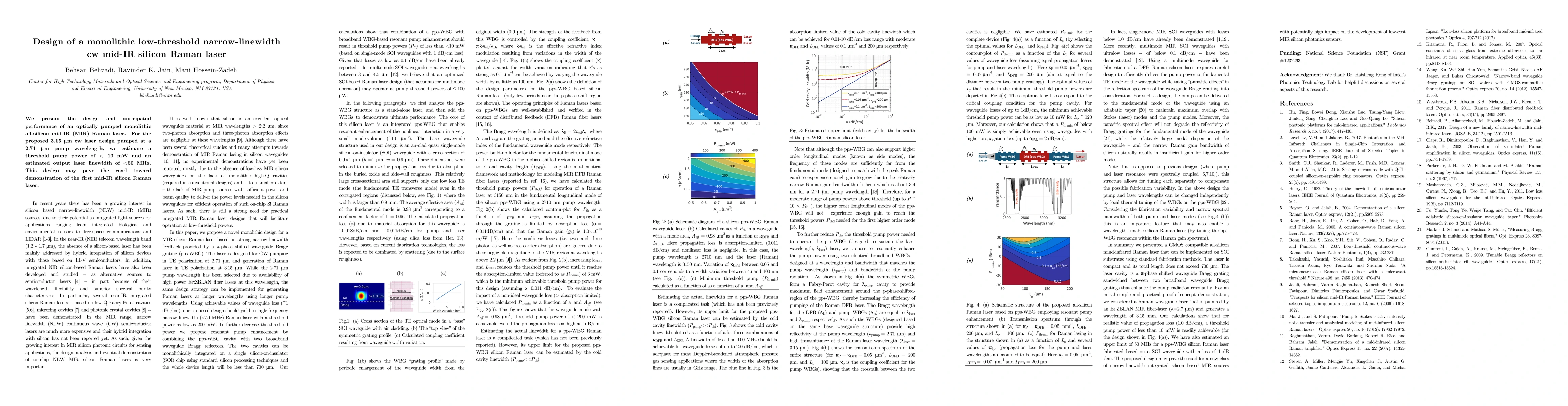 This paper details the design of an all-silicon mid-IR Raman laser operating at 3.15 um, achieving a low threshold pump power of < 10 mW and a narrow linewidth of <50 MHz, potentially marking the first demonstration of such a laser.