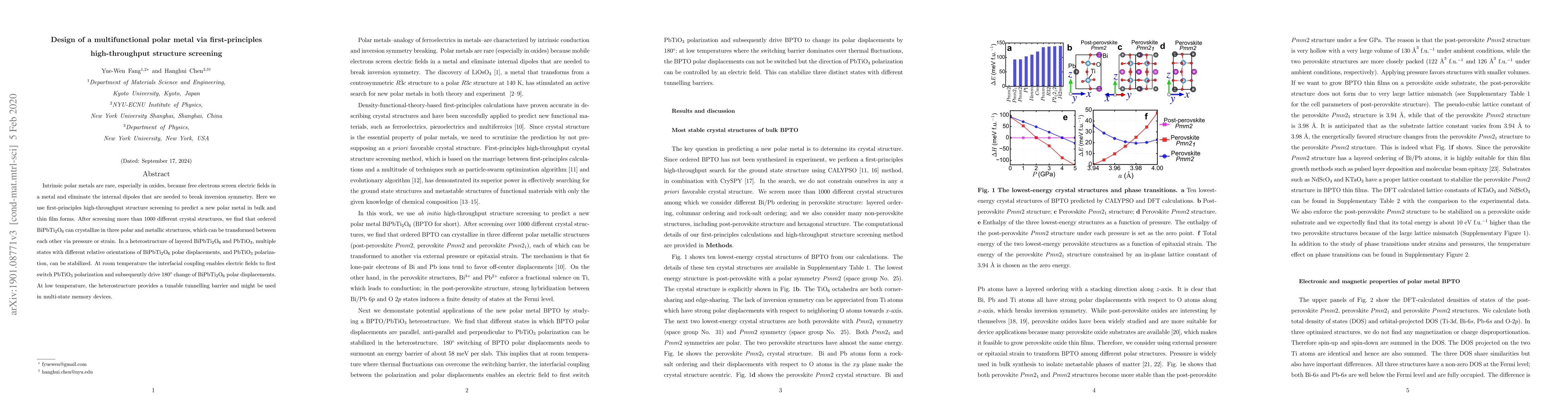 Intrinsic polar metals are rare, especially in oxides, because free electrons screen electric fields in a metal and eliminate the internal dipoles that are needed to break inversion symmetry. Here we use first-principles high-throughput structure screening to predict a new polar metal in bulk and thin film forms. After screening more than 1000 different crystal structures, we find that ordered BiPbTi2O6 can crystallize in three polar and metallic structures, which can be transformed between via pressure or strain. In a heterostructure of layered BiPbTi2O6 and PbTiO3, multiple states with different relative orientations of BiPbTi2O6 polar displacements, and PbTiO3 polarization, can be stabilized. At room temperature, the interfacial coupling enables electric fields to first switch PbTiO3 polarization and subsequently drive 180{\deg} change of BiPbTi2O6 polar displacements. At low temperatures, the heterostructure provides a tunable tunnelling barrier and might be used in multi-state memory devices.
