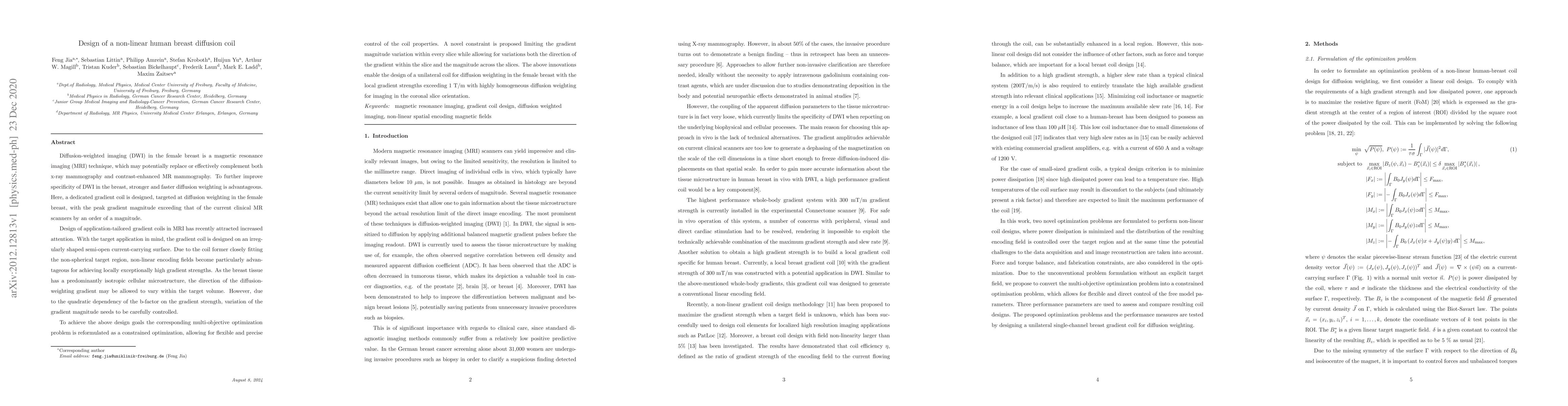This paper presents the design of a non-linear diffusion coil for enhancing diffusion-weighted imaging in the female breast, aiming to improve specificity over traditional mammography. The coil achieves high gradient strengths and homogeneous diffusion weighting through a novel optimization approach that allows for precise control over gradient magnitude and direction.