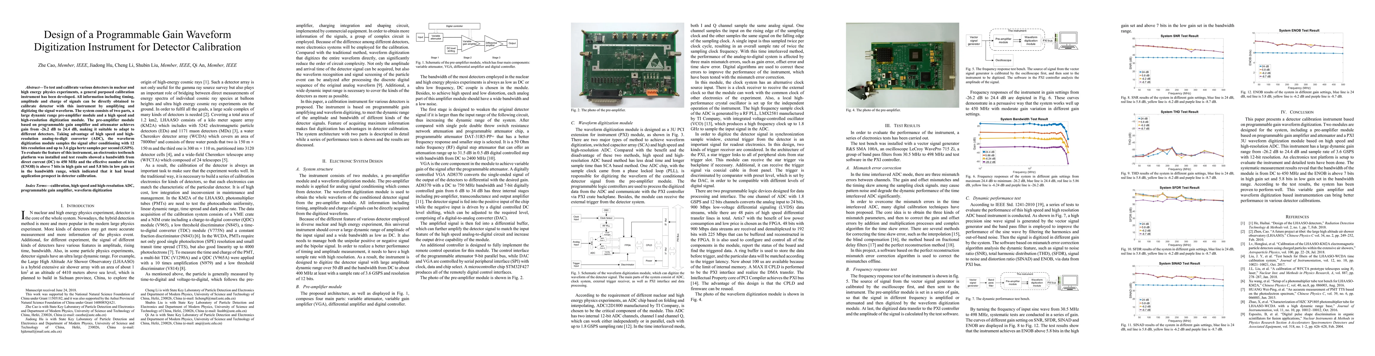 To test and calibrate various detectors in nuclear and high energy physics experiments, a general purposed calibration instrument has been developed. All information including timing, amplitude and charge of signals can be directly obtained to calibrate detector with this instrument by amplifying and digitizing the signal waveform. The system consists of two parts, a large dynamic range pre-amplifier module and a high speed and high-resolution digitization module. The pre-amplifier module based on programmable gain amplifier and attenuator achieves gain from -26.2 dB to 24.4 dB, making it suitable to adapt to different detectors. Taking advantage of high speed and high-resolution analog-to-digit converter (ADC), the waveform digitization module samples the signal after conditioning with 12 bits resolution and up to 3.6 giga hertz samples per second (GSPS). To evaluate the feature of this instrument, an electronics testbench platform was installed and test results showed a bandwidth from direct current (DC) to 450 MHz and the effective number of bits (ENOB) is above 7 bits in high gain set and 5.8 bits in low gain set in the bandwidth range, which indicated that it had broad application prospect in detector calibration.