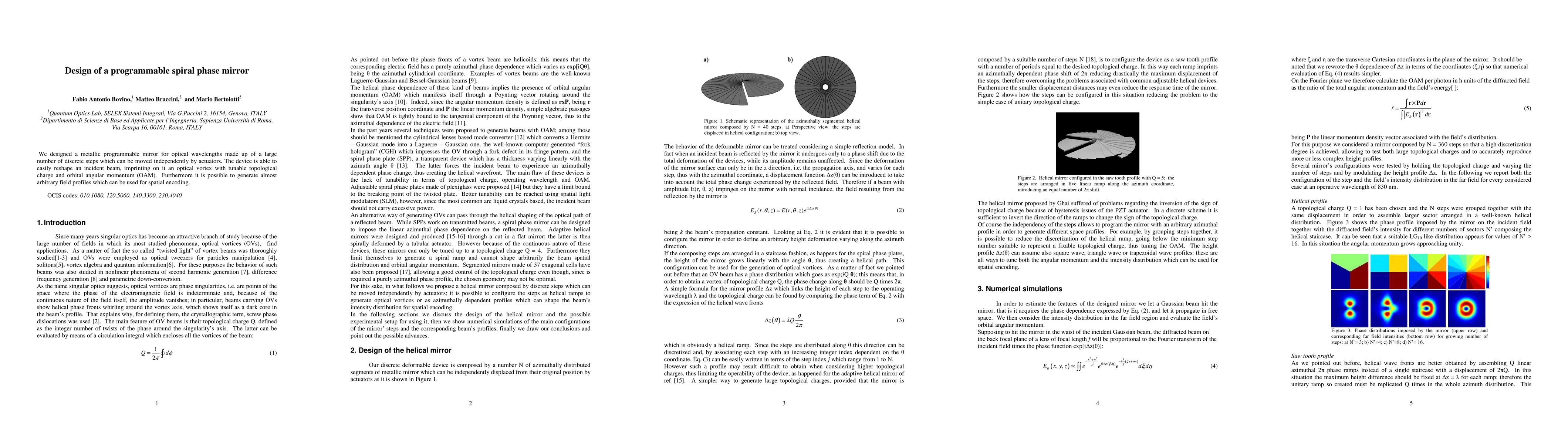 We designed a metallic programmable mirror for optical wavelengths made up of a large number of discrete steps which can be moved independently by actuators. The device is able to easily reshape an incident beam, imprinting on it an optical vortex with tunable topological charge and orbital angular momentum (OAM). Furthermore it is possible to generate almost arbitrary field profiles which can be used for spatial encoding.