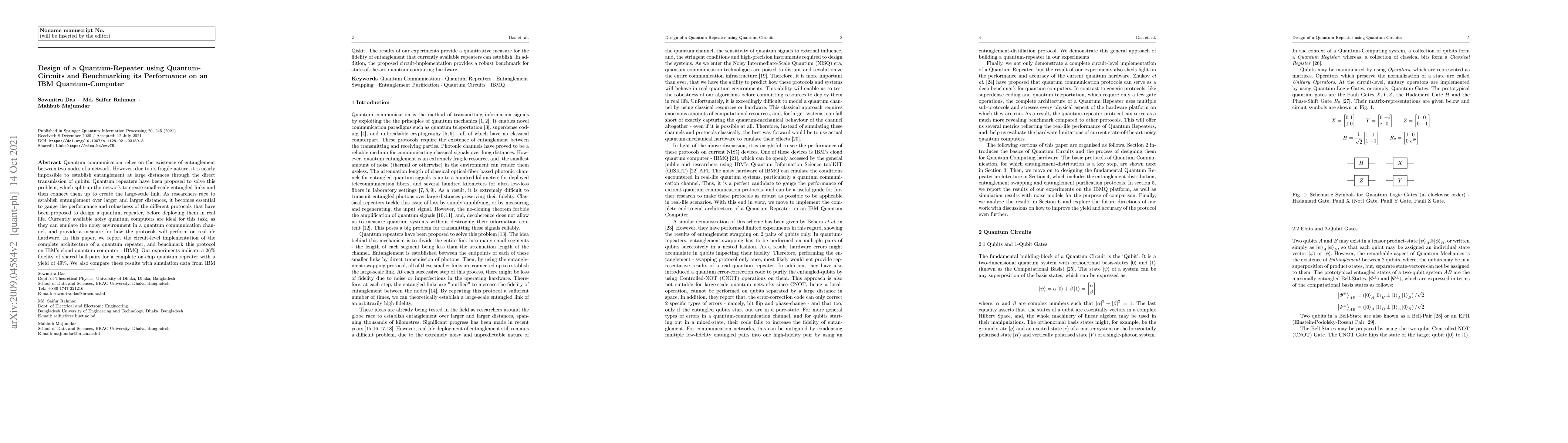 This paper details the design and implementation of a quantum repeater using quantum circuits, and benchmarks its performance on IBM's quantum computer. Experimental results show a 26% fidelity for shared bell-pairs, providing a quantitative measure for current entanglement capabilities and a robust benchmark for quantum computing hardware.