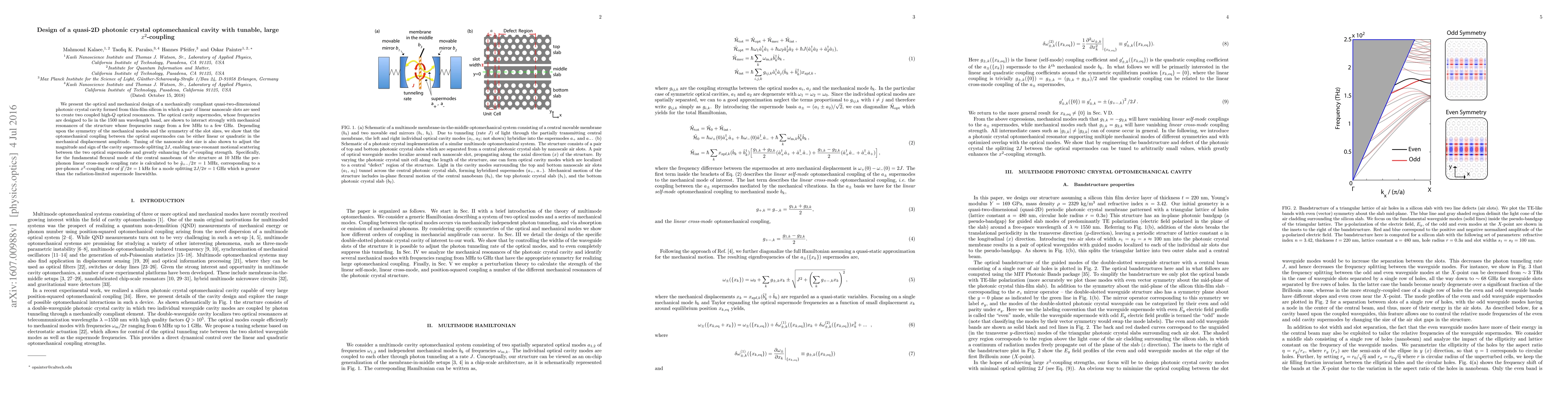 We present the optical and mechanical design of a mechanically compliant quasi-two-dimensional photonic crystal cavity formed from thin-film silicon in which a pair of linear nanoscale slots are used to create two coupled high-$Q$ optical resonances. The optical cavity supermodes, whose frequencies are designed to lie in the $1500$~nm wavelength band, are shown to interact strongly with mechanical resonances of the structure whose frequencies range from a few MHz to a few GHz. Depending upon the symmetry of the mechanical modes and the symmetry of the slot sizes, we show that the optomechanical coupling between the optical supermodes can be either linear or quadratic in the mechanical displacement amplitude. Tuning of the nanoscale slot size is also shown to adjust the magnitude and sign of the cavity supermode splitting $2J$, enabling near-resonant motional scattering between the two optical supermodes and greatly enhancing the $x^2$-coupling strength. Specifically, for the fundamental flexural mode of the central nanobeam of the structure at $10$~MHz the per-phonon linear cross-mode coupling rate is calculated to be $\tilde{g}_{+-}/2\pi = 1$~MHz, corresponding to a per-phonon $x^2$-coupling rate of $\tilde{g}'/2\pi=1$~kHz for a mode splitting $2J/2\pi = 1$~GHz which is greater than the radiation-limited supermode linewidths.