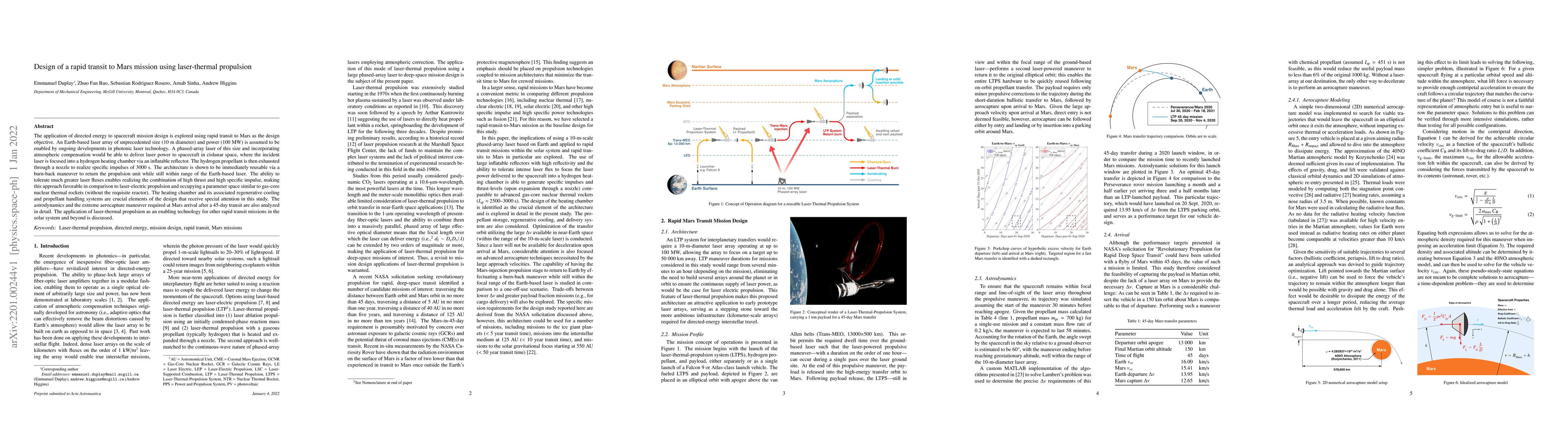 This paper explores the design of a rapid transit mission to Mars using laser-thermal propulsion, leveraging a large, powerful Earth-based laser to focus on a spacecraft's hydrogen propellant chamber. The proposed system achieves high thrust and specific impulse, enabling a 45-day transit and reusable architecture, and is compared favorably to other propulsion methods.