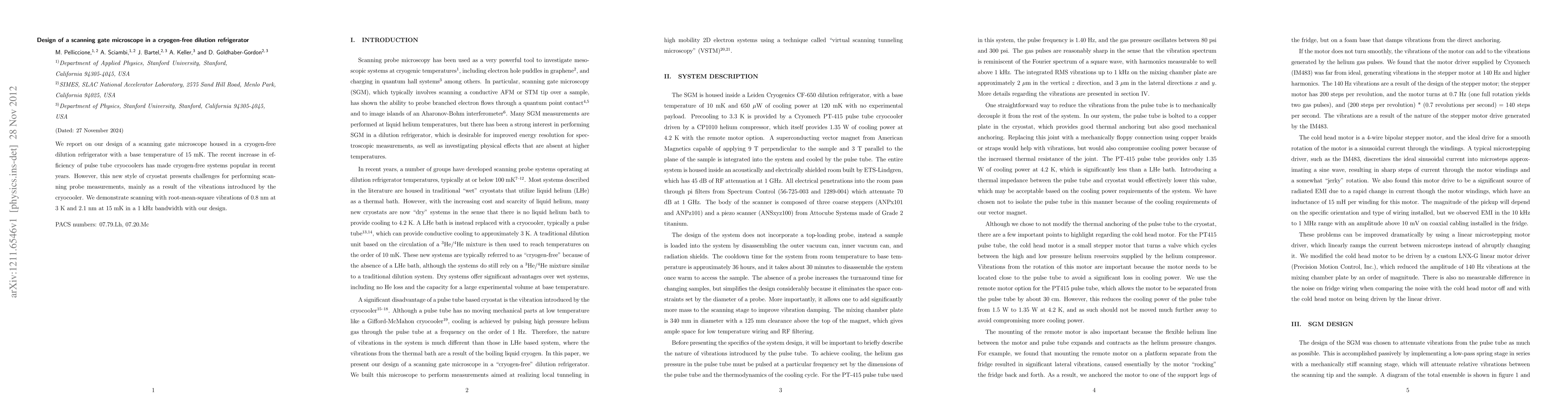 The paper describes the design of a scanning gate microscope integrated into a cryogen-free dilution refrigerator, achieving effective scanning at temperatures as low as 15 mK despite the vibrations from the cryocooler, with root-mean-square vibrations of 0.8 nm at 3 K and 2.1 nm at 15 mK within a 1 kHz bandwidth.