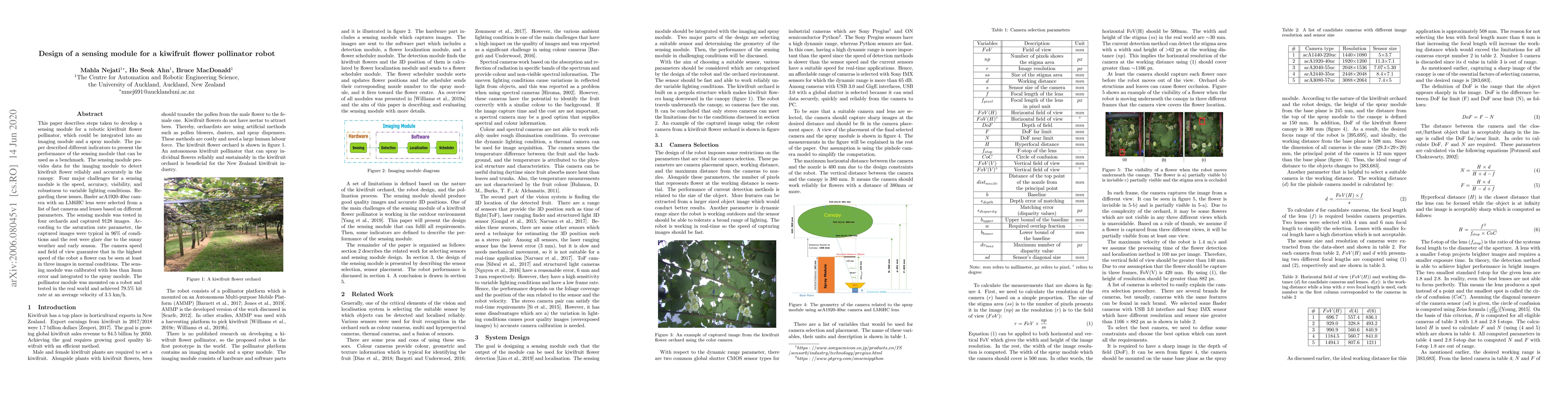 This paper describes steps taken to develop a sensing module for a robotic kiwifruit flower pollinator, which could be integrated into an imaging module and a spray module. The paper described different indicators to present the performance of the sensing module that can be used as a benchmark. The sensing module provides data for the imaging module to detect kiwifruit flower reliably and accurately in the canopy. Four major challenges for a sensing module is the speed, accuracy, visibility, and robustness to variable lighting conditions. Regarding these issues, Basler acA1920-40uc camera with an LM6HC lens were selected from a list of fast cameras and lenses based on different parameters. The sensing module was tested in four orchards and captured 9128 images. According to the saturation rate parameter, the captured images were typical in 96% of conditions and the rest were glare due to the sunny weather and early season. The camera speed and field of view guarantee that in the highest speed of the robot a flower can be seen at least in three images in normal conditions. The sensing module was calibrated with less than 3 mm error and integrated to the spray module. The pollinator module was mounted on a robot and tested in the real world and achieved 79.5% hit rate at an average velocity of 3.5 km/h.