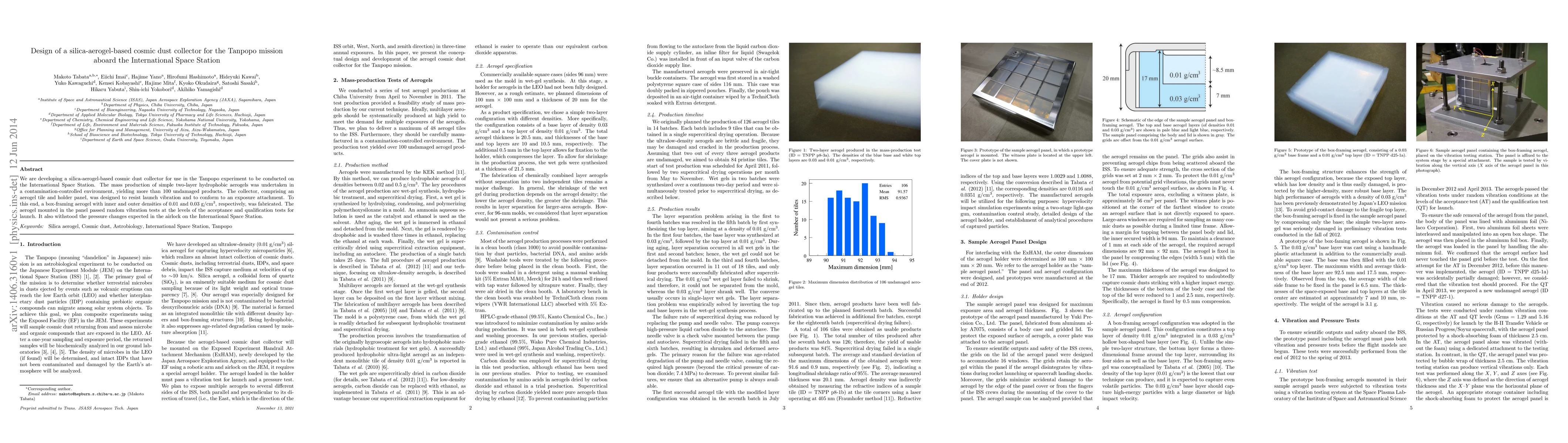 The paper details the design and production of a silica-aerogel-based cosmic dust collector for the Tanpopo mission on the International Space Station, featuring mass-produced two-layer hydrophobic aerogels that successfully passed launch vibration and pressure tests. The aerogel collector was engineered to withstand launch conditions and conform to the ISS airlock.