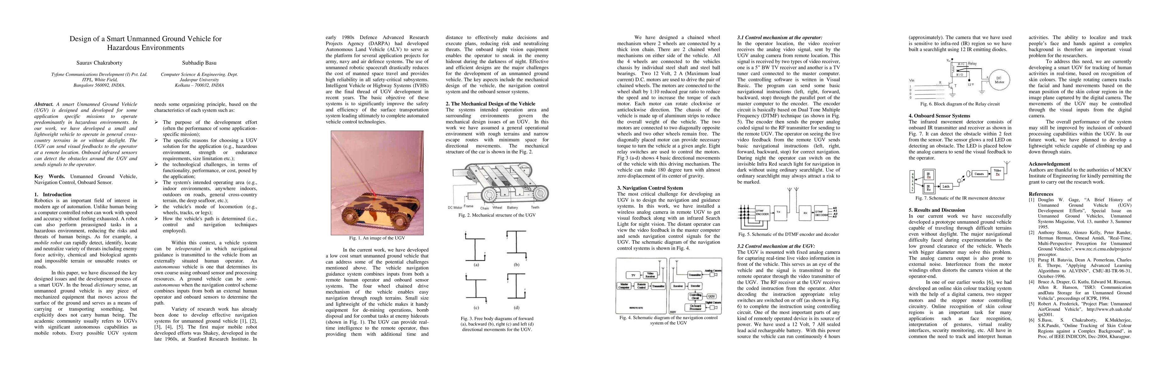 A smart Unmanned Ground Vehicle is designed to operate in hazardous environments, sending visual feedback to operators and detecting obstacles with infrared sensors. The vehicle can navigate in general cross-country terrains day or night.