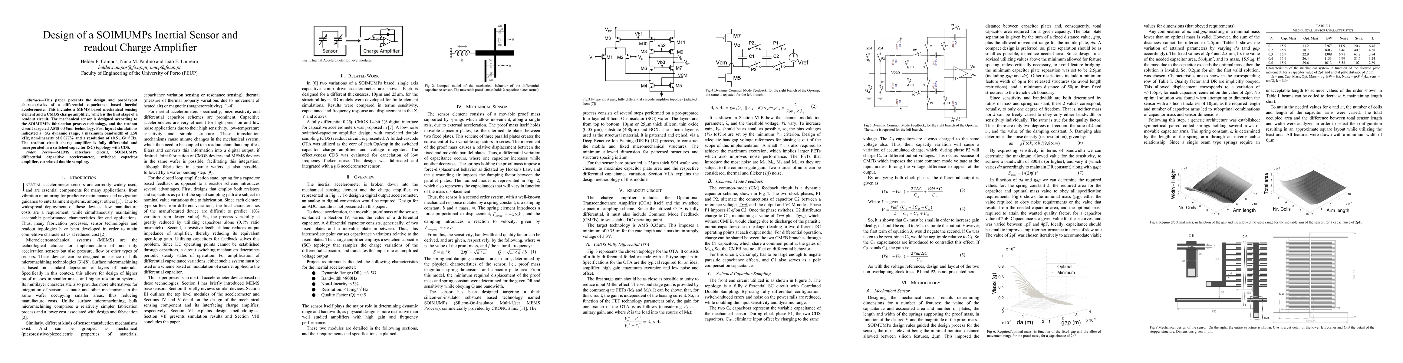This paper presents the design and post-layout characteristics of a differential capacitance based inertial accelerometer This includes a MEMS based mechanical sensing element and a CMOS charge amplifier, which is the first stage of a readout circuit. The mechanical sensor is designed according to the SOIMUMPs fabrication process technology, and the readout circuit targeted AMS 0.35um technology. Post layout simulations indicated a +/-5G dynamic range, a maximum bandwidth of 1.58 kHz, non-linearity of 0.077% and a resolution of 10.5 uG/Hz^0.5. The readout circuit charge amplifier is fully differential and incorporated in a switched capacitor (SC) topology with CDS.