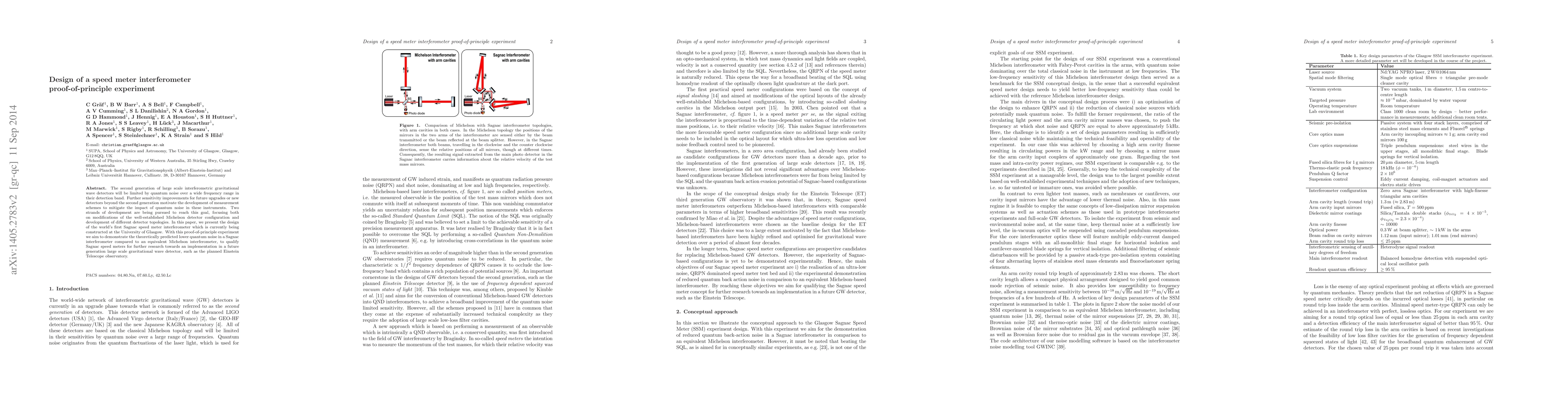The second generation of large scale interferometric gravitational wave detectors will be limited by quantum noise over a wide frequency range in their detection band. Further sensitivity improvements for future upgrades or new detectors beyond the second generation motivate the development of measurement schemes to mitigate the impact of quantum noise in these instruments. Two strands of development are being pursued to reach this goal, focusing both on modifications of the well-established Michelson detector configuration and development of different detector topologies. In this paper, we present the design of the world's first Sagnac speed meter interferometer which is currently being constructed at the University of Glasgow. With this proof-of-principle experiment we aim to demonstrate the theoretically predicted lower quantum noise in a Sagnac interferometer compared to an equivalent Michelson interferometer, to qualify Sagnac speed meters for further research towards an implementation in a future generation large scale gravitational wave detector, such as the planned Einstein Telescope observatory.