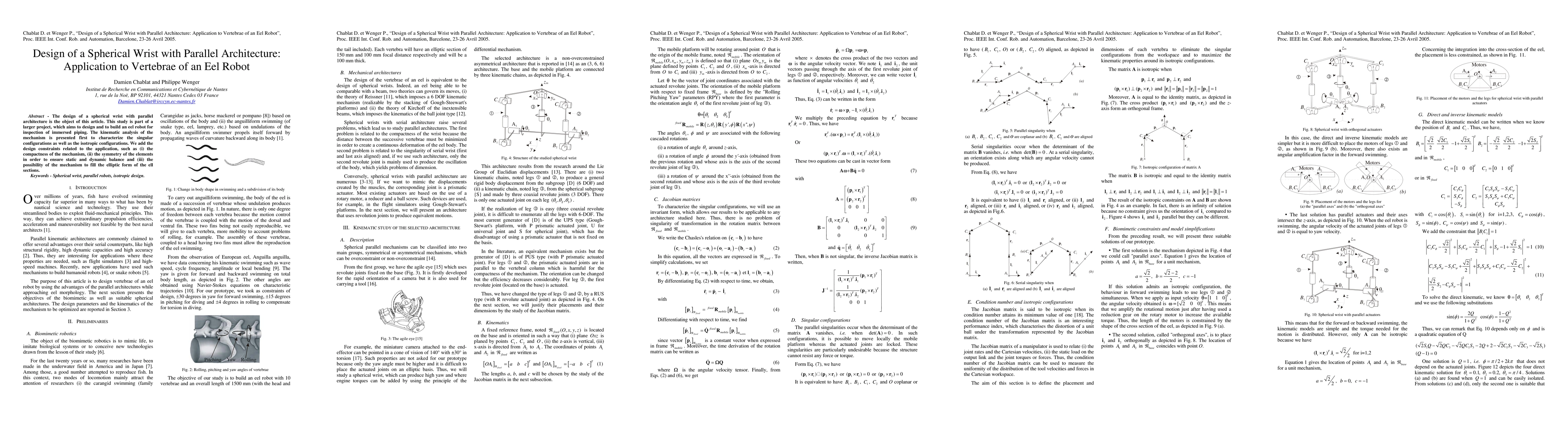 The design of a spherical wrist with parallel architecture is the object of this article. This study is part of a larger project, which aims to design and to build an eel robot for inspection of immersed piping. The kinematic analysis of the mechanism is presented first to characterize the singular configurations as well as the isotropic configurations. We add the design constraints related to the application, such as (i) the compactness of the mechanism, (ii) the symmetry of the elements in order to ensure static and dynamic balance and (iii) the possibility of the mechanism to fill the elliptic form of the ell sections.