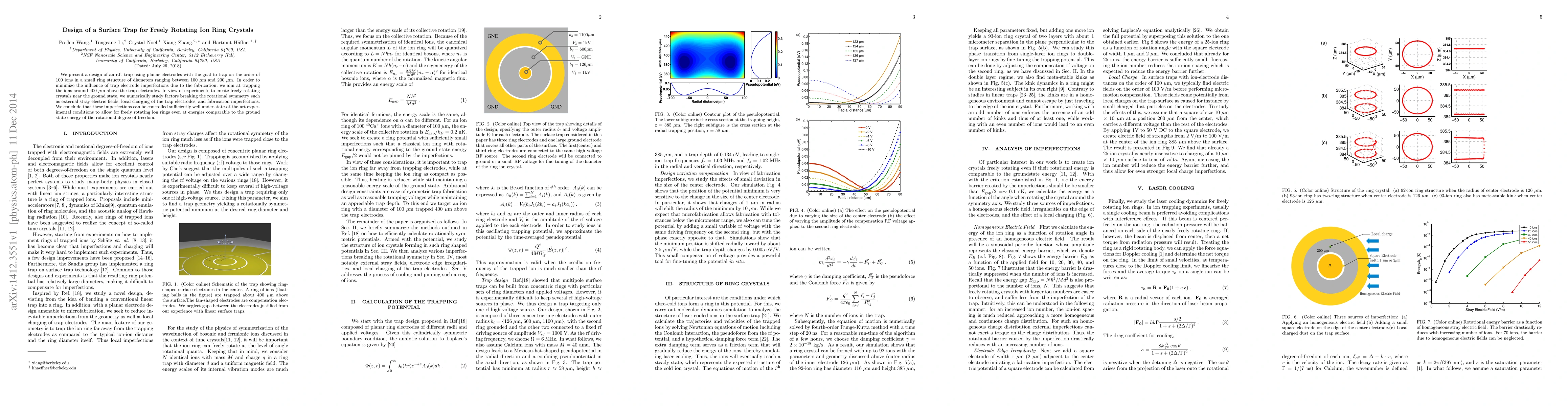 We present a design of an r.f. trap using planar electrodes with the goal to trap on the order of 100 ions in a small ring structure of diameters ranging between 100 $\mu$m and 200 $\mu$m. In order to minimize the influence of trap electrode imperfections due to the fabrication, we aim at trapping the ions around 400 $\mu$m above the trap electrodes. In view of experiments to create freely rotating crystals near the ground state, we numerically study factors breaking the rotational symmetry such as external stray electric fields, local charging of the trap electrodes, and fabrication imperfections. We conclude that these imperfections can be controlled sufficiently well under state-of-the-art experimental conditions to allow for freely rotating ion rings even at energies comparable to the ground state energy of the rotational degree-of-freedom.