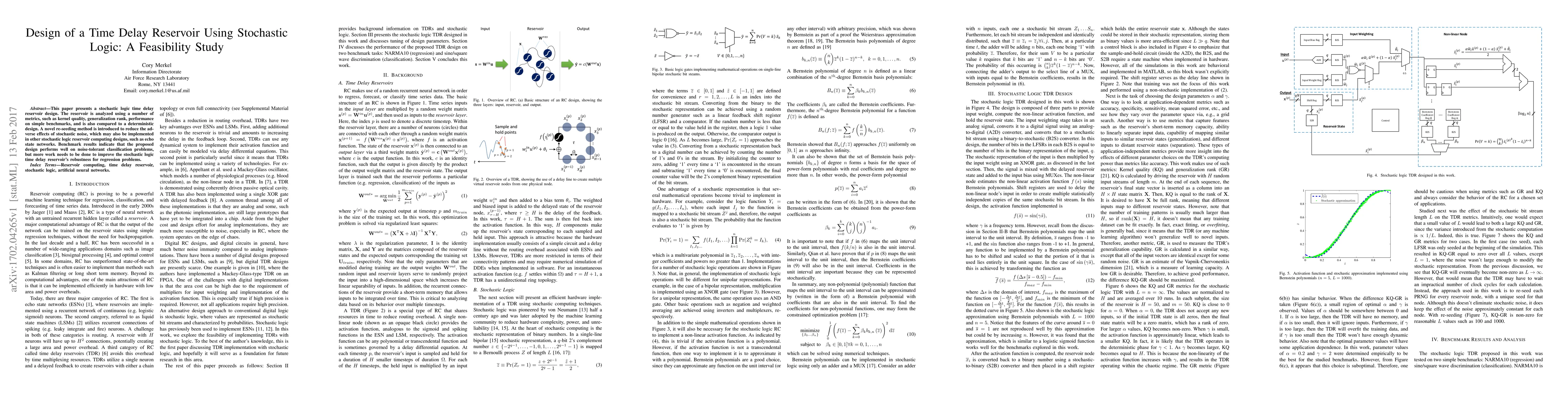 This paper explores the feasibility of a stochastic logic time delay reservoir, analyzing its performance against metrics like kernel quality and generalization rank. A novel re-seeding method is introduced to mitigate stochastic noise, showing promising results in noise-tolerant classification but requiring further improvements for regression tasks.