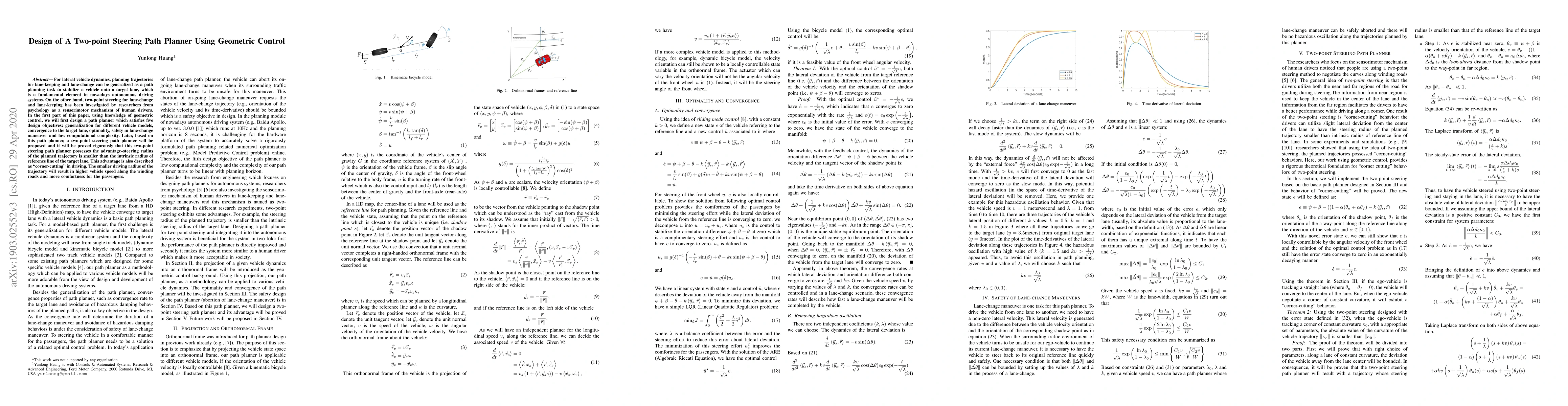 For lateral vehicle dynamics, planning trajectories for lane-keeping and lane-change can be generalized as a path planning task to stabilize a vehicle onto a target lane, which is a fundamental element in nowadays autonomous driving systems. On the other hand, two-point steering for lane-change and lane-keeping has been investigated by researchers from psychology as a sensorimotor mechanism of human drivers. In the first part of this paper, using knowledge of geometric control, we will first design a path planner which satisfies five design objectives: generalization for different vehicle models, convergence to the target lane, optimality, safety in lane-change maneuver and low computational complexity. Later, based on this path planner, a two-point steering path planner will be proposed and it will be proved rigorously that this two-point steering path planner possesses the advantage--steering radius of the planned trajectory is smaller than the intrinsic radius of reference line of the target lane. This advantage is also described as "corner-cutting" in driving. The smaller driving radius of the trajectory will result in higher vehicle speed along the winding roads and more comfortness for the passengers.