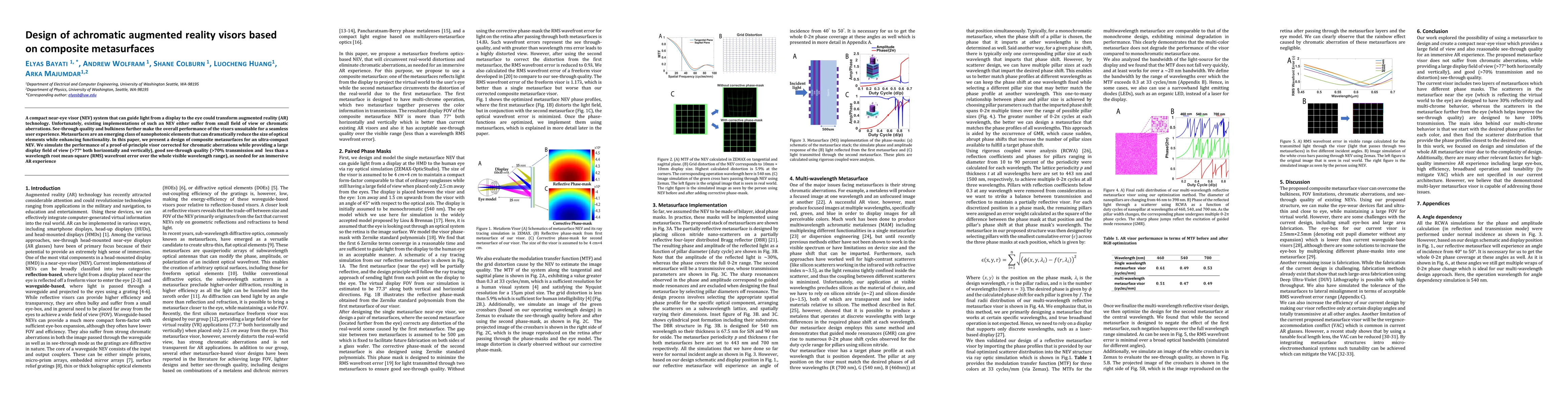 A compact near-eye visor (NEV) system that can guide light from a display to the eye could transform augmented reality (AR) technology. Unfortunately, existing implementations of such an NEV either suffer from small field of view or chromatic aberrations. See-through quality and bulkiness further make the overall performance of the visors unsuitable for a seamless user experience. Metasurfaces are an emerging class of nanophotonic elements that can dramatically reduce the size of optical elements while enhancing functionality. In this paper, we present a design of composite metasurfaces for an ultra-compact NEV. We simulate the performance of a proof-of-principle visor corrected for chromatic aberrations while providing a large display field of view (>77{\deg} both horizontally and vertically), good see-through quality (>70% transmission and less than a wavelength root mean-square (RMS) wavefront error over the whole visible wavelength range), as needed for an immersive AR experience.