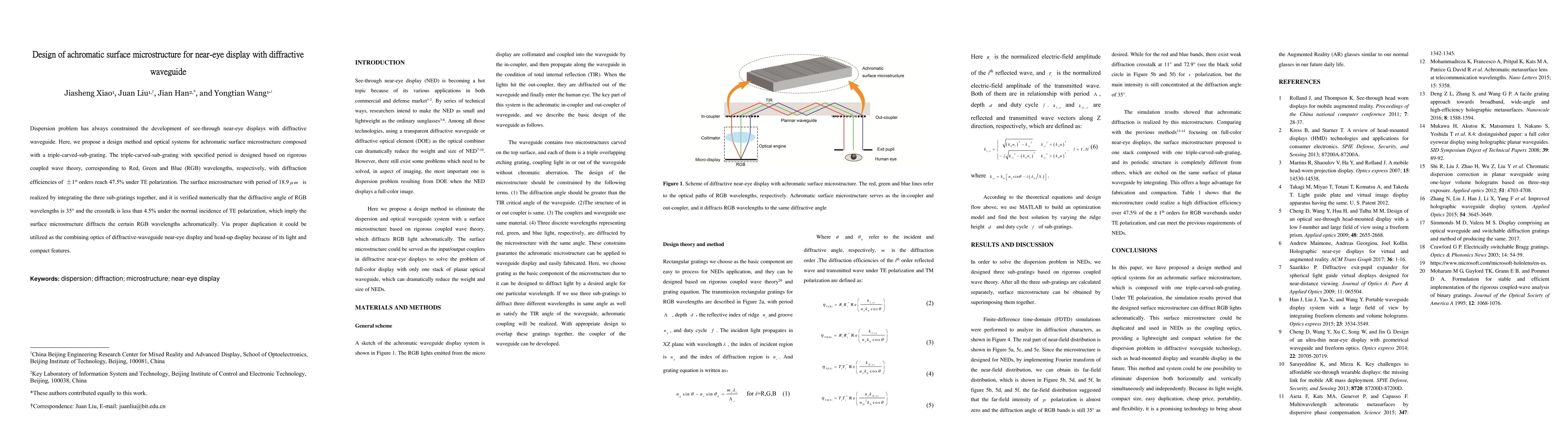 This research proposes a design for an achromatic surface microstructure to address dispersion issues in near-eye displays using diffractive waveguides. The solution involves a triple-carved-sub-grating with specific periods for Red, Green, and Blue wavelengths, achieving high diffraction efficiencies and low crosstalk. This compact, lightweight optic could serve as combining optics for near-eye and head-up displays.