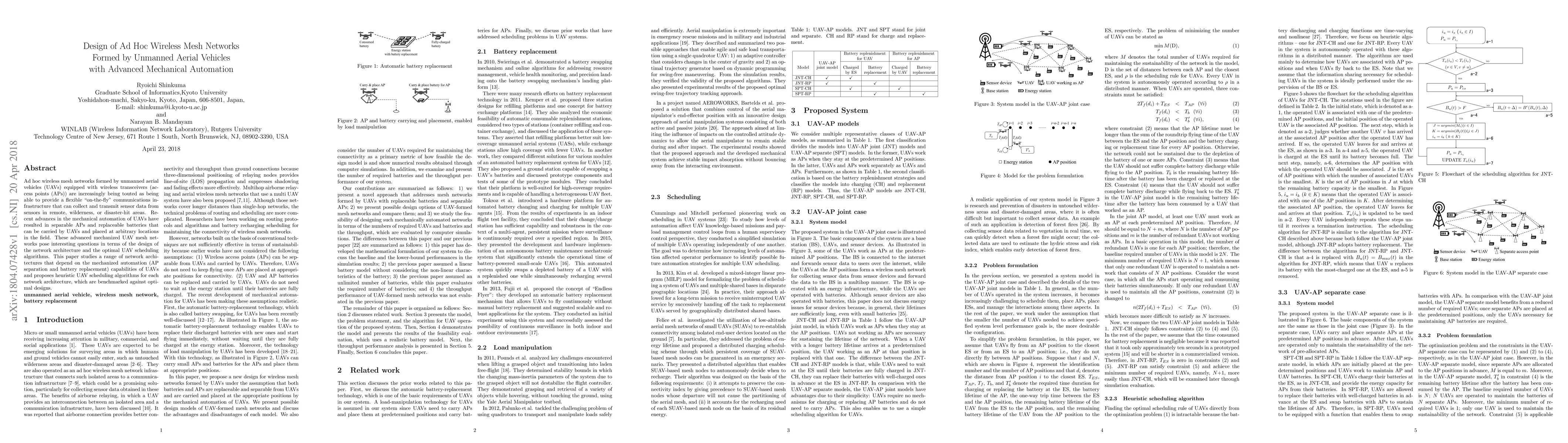 This paper explores ad hoc wireless mesh networks formed by unmanned aerial vehicles (UAVs) with advanced mechanical automation, focusing on network architectures leveraging separable access points and replaceable batteries. It proposes heuristic UAV scheduling algorithms for these architectures and benchmarks them against optimal designs.