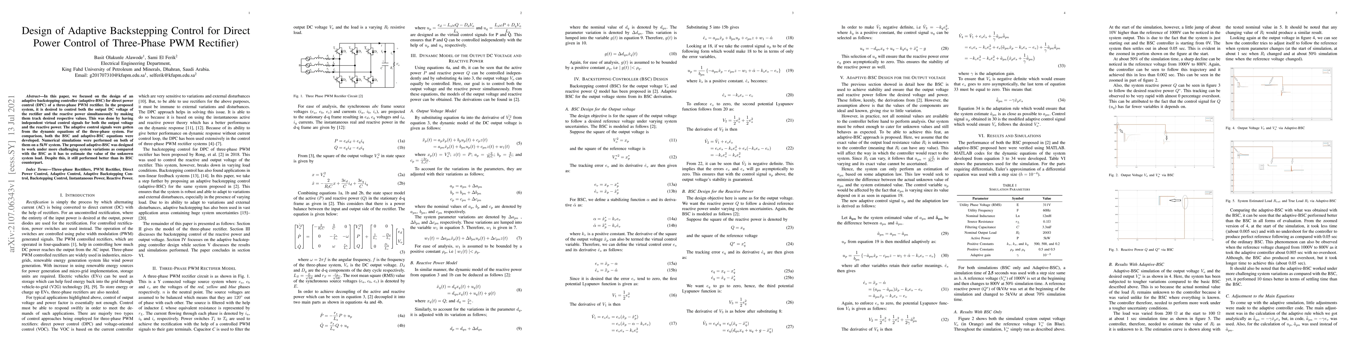 The paper presents an adaptive backstepping control strategy for three-phase PWM rectifiers, incorporating load estimation and demonstrating improved performance under varying conditions compared to traditional backstepping control.