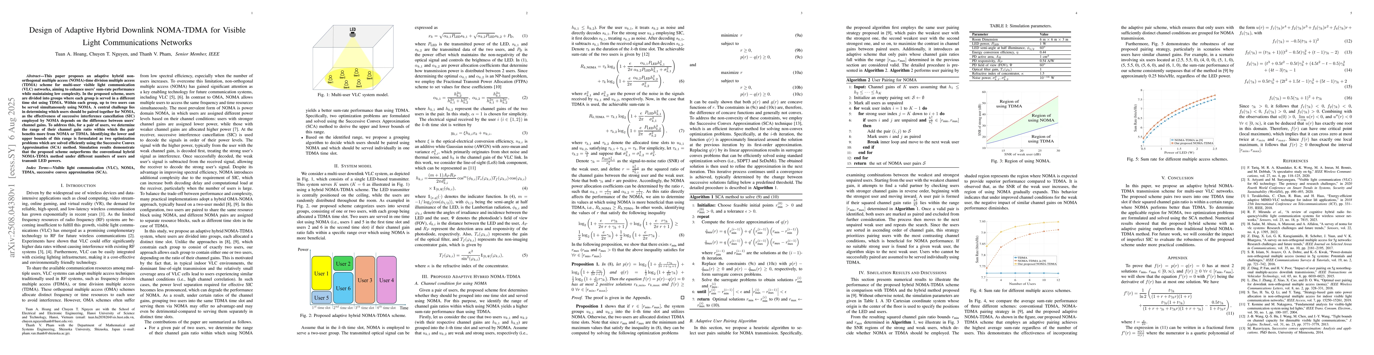 This paper proposes an adaptive hybrid non-orthogonal multiple access (NOMA)-time division multiple access (TDMA) scheme for multi-user visible light communication (VLC) networks, aiming to enhance users' sum-rate performance while maintaining low complexity. In the proposed scheme, users are divided into groups where each group is served in a different time slot using TDMA. Within each group, up to two users can be served simultaneously using NOMA. A central challenge lies in determining which users should be paired together for NOMA, as the effectiveness of successive interference cancellation (SIC) employed by NOMA depends on the difference between users' channel gains. To address this, for a pair of users, we determine the range of their channel gain ratio within which the pair benefits more from NOMA or TDMA. Identifying the lower and upper bounds of this range is formulated as two optimization problems which are solved efficiently using the Successive Convex Approximation (SCA) method. Simulation results demonstrate that the proposed scheme outperforms the conventional hybrid NOMA-TDMA method under different numbers of users and transmit LED powers.