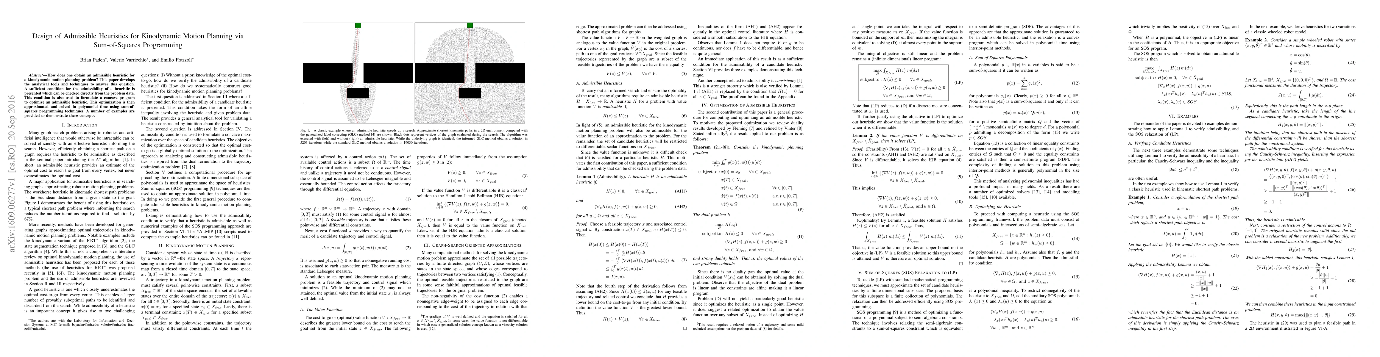 How does one obtain an admissible heuristic for a kinodynamic motion planning problem? This paper develops the analytical tools and techniques to answer this question. A sufficient condition for the admissibility of a heuristic is presented which can be checked directly from the problem data. This condition is also used to formulate a concave program to optimize an admissible heuristic. This optimization is then approximated and solved in polynomial time using sum-of-squares programming techniques. A number of examples are provided to demonstrate these concepts.