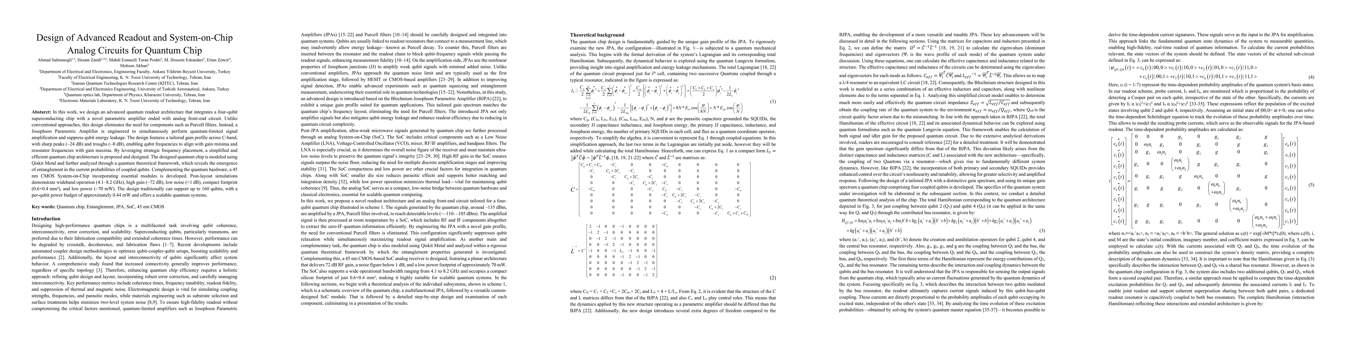 This research introduces an advanced quantum readout architecture that integrates a superconducting quantum chip with a novel parametric amplifier and analog front-end circuit. It eliminates the need for Purcell filters by engineering a Josephson Parametric Amplifier for quantum-limited signal amplification and qubit leakage suppression, featuring a tailored gain profile with sharp peaks and troughs for optimal qubit and resonator frequency alignment.