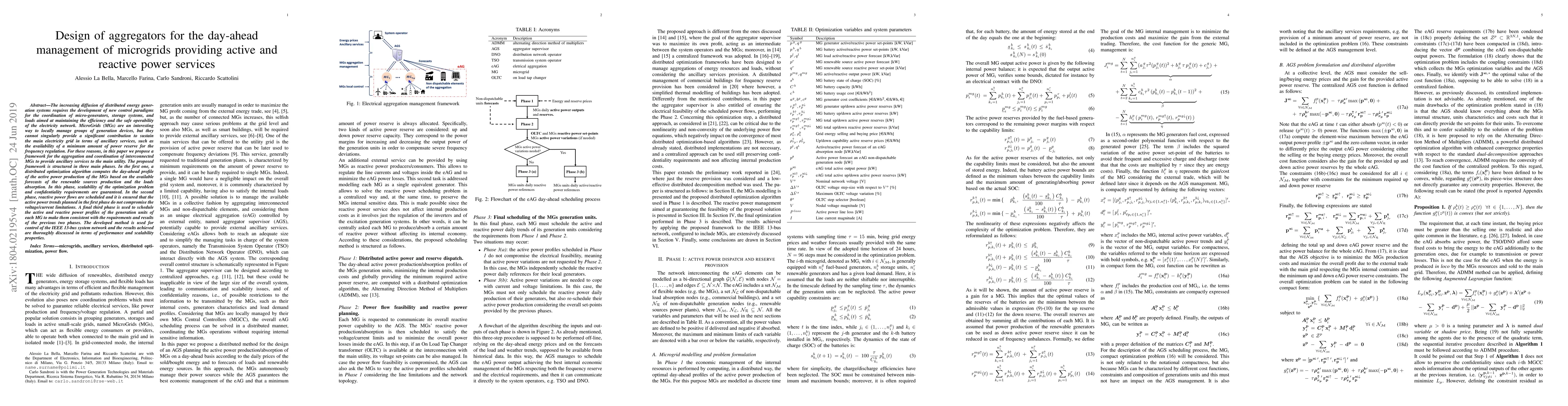 The increasing diffusion of distributed energy generation systems requires the development of new control paradigms for the coordination of micro-generators, storage systems, and loads aimed at maintaining the efficiency and the safe operability of the electricity network. MicroGrids (MGs) are an interesting way to locally manage groups of generation devices, but they cannot singularly provide a significant contribution to sustain the main electricity grid in terms of ancillary services, such as the availability of a minimum amount of power reserve for the frequency regulation. For these reasons, in this paper we propose a framework for the aggregation and coordination of interconnected MGs to provide ancillary services to the main utility. The proposed framework is structured in three main phases. In the first one, a distributed optimization algorithm computes the day-ahead profile of the active power production of the MGs based on the available forecasts of the renewable sources production and the loads absorption. In this phase, scalability of the optimization problem and confidentiality requirements are guaranteed. In the second phase, reactive power flows are scheduled and it is ensured that the active power trends planned in the first phase do not compromise the voltage/current limitations. A final third phase is used to schedule the active and reactive power profiles of the generation units of each MG to make them consistent with the requirements and results of the previous two phases. The developed method is used for control of the IEEE 13-bus system network and the results achieved are thoroughly discussed in terms of performance and scalability properties.