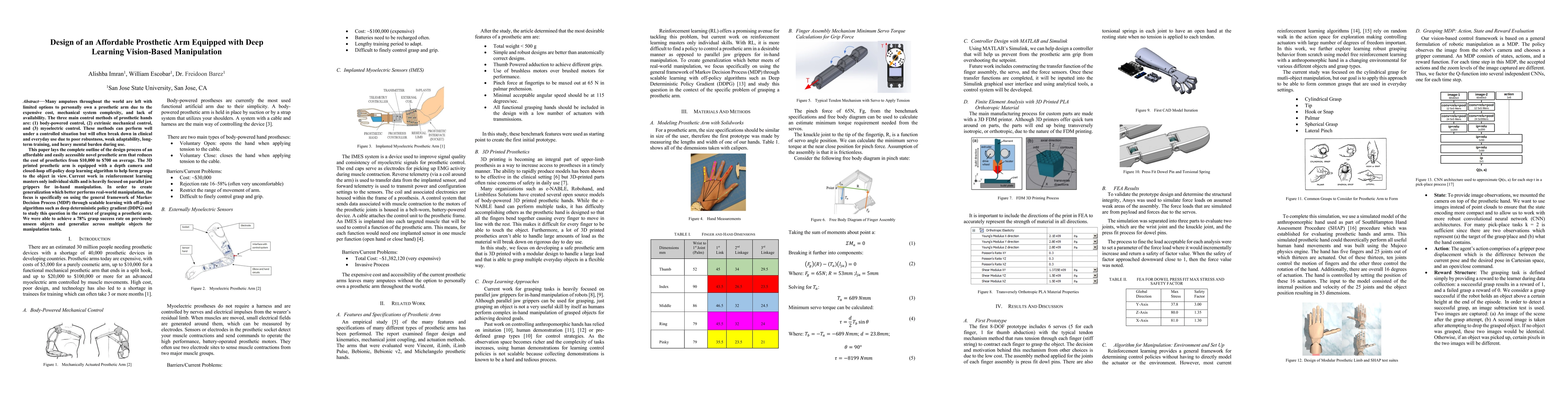 Many amputees throughout the world are left with limited options to personally own a prosthetic arm due to the expensive cost, mechanical system complexity, and lack of availability. The three main control methods of prosthetic hands are: (1) body-powered control, (2) extrinsic mechanical control, and (3) myoelectric control. These methods can perform well under a controlled situation but will often break down in clinical and everyday use due to poor robustness, weak adaptability, long-term training, and heavy mental burden during use. This paper lays the complete outline of the design process of an affordable and easily accessible novel prosthetic arm that reduces the cost of prosthetics from $10,000 to $700 on average. The 3D printed prosthetic arm is equipped with a depth camera and closed-loop off-policy deep learning algorithm to help form grasps to the object in view. Current work in reinforcement learning masters only individual skills and is heavily focused on parallel jaw grippers for in-hand manipulation. In order to create generalization, which better performs real-world manipulation, the focus is specifically on using the general framework of Markov Decision Process (MDP) through scalable learning with off-policy algorithms such as deep deterministic policy gradient (DDPG) and to study this question in the context of grasping a prosthetic arm. We were able to achieve a 78% grasp success rate on previously unseen objects and generalize across multiple objects for manipulation tasks. This work will make prosthetics cheaper, easier to use and accessible globally for amputees. Future work includes applying similar approaches to other medical assistive devices where a human is interacting with a machine to complete a task.