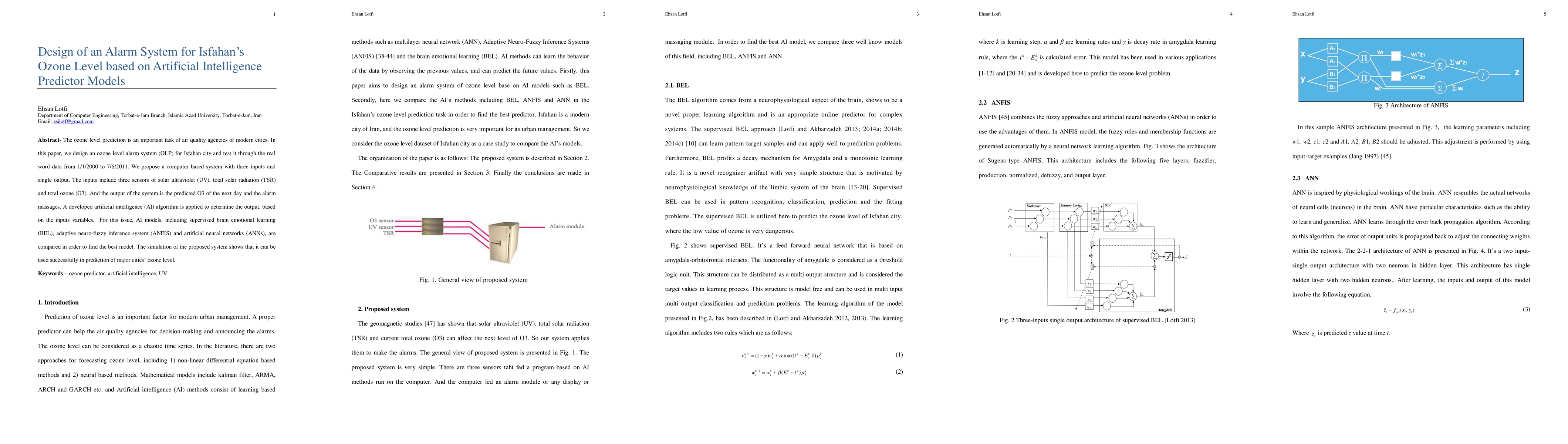 This paper designs an ozone level alarm system (OLP) for Isfahan using AI models, including BEL, ANFIS, and ANNs, to predict ozone levels based on solar UV, TSR, and O3 inputs. The best-performing AI model is identified through simulations using real-world data from 2000 to 2011.