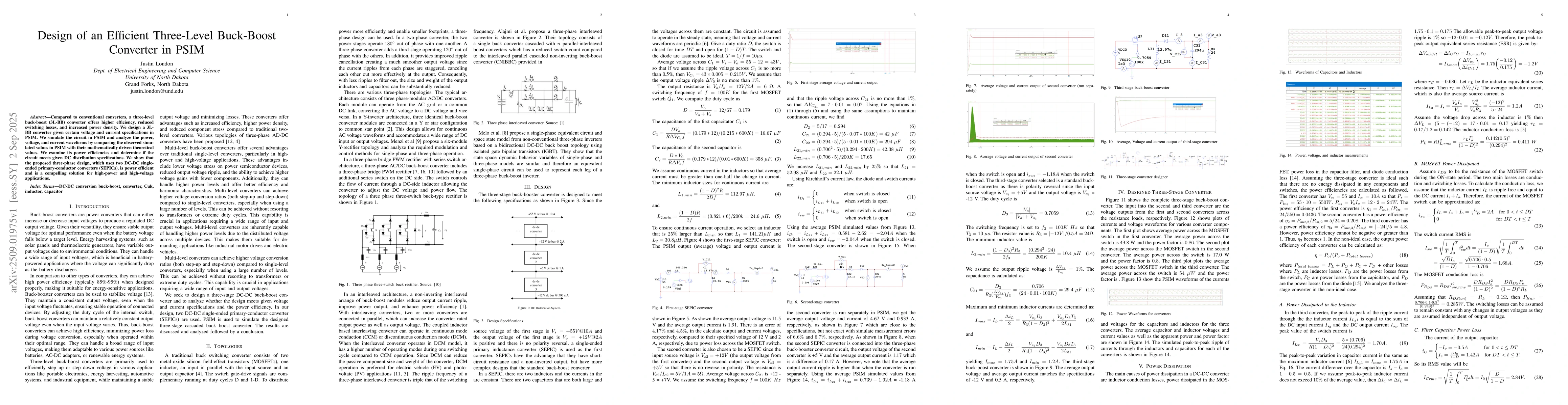 Compared to conventional converters, a three-level buck-boost (3L-BB) converter offers higher efficiency, reduced switching losses, and increased power density. We design a 3L-BB converter given certain voltage and current specifications in PSIM. We simulate the circuit in PSIM and analyze the power, voltage, and current waveforms by comparing the observed simulated values in PSIM with their mathematically driven theoretical values. We examine its power efficiencies and determine if the circuit meets given DC distribution specifications. We show that the proposed three-phase design, which uses two DC-DC single-ended primary-conductor converters (SEPICs), is power efficient and is a compelling solution for high-power and high-voltage applications.