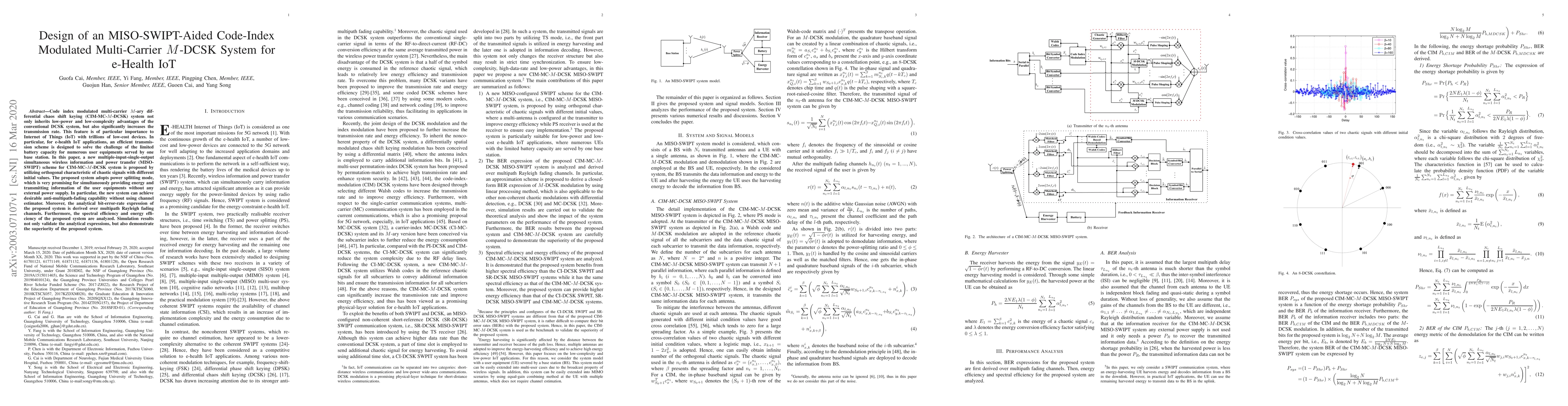 This paper proposes a new MISO-SWIPT-aided CIM-MC-M-DCSK system for e-Health IoT, enhancing transmission rate and efficiency while providing simultaneous energy and information transfer without external power. The system utilizes chaotic signal orthogonality, demonstrates anti-multipath-fading capability, and offers superior performance in simulations.
